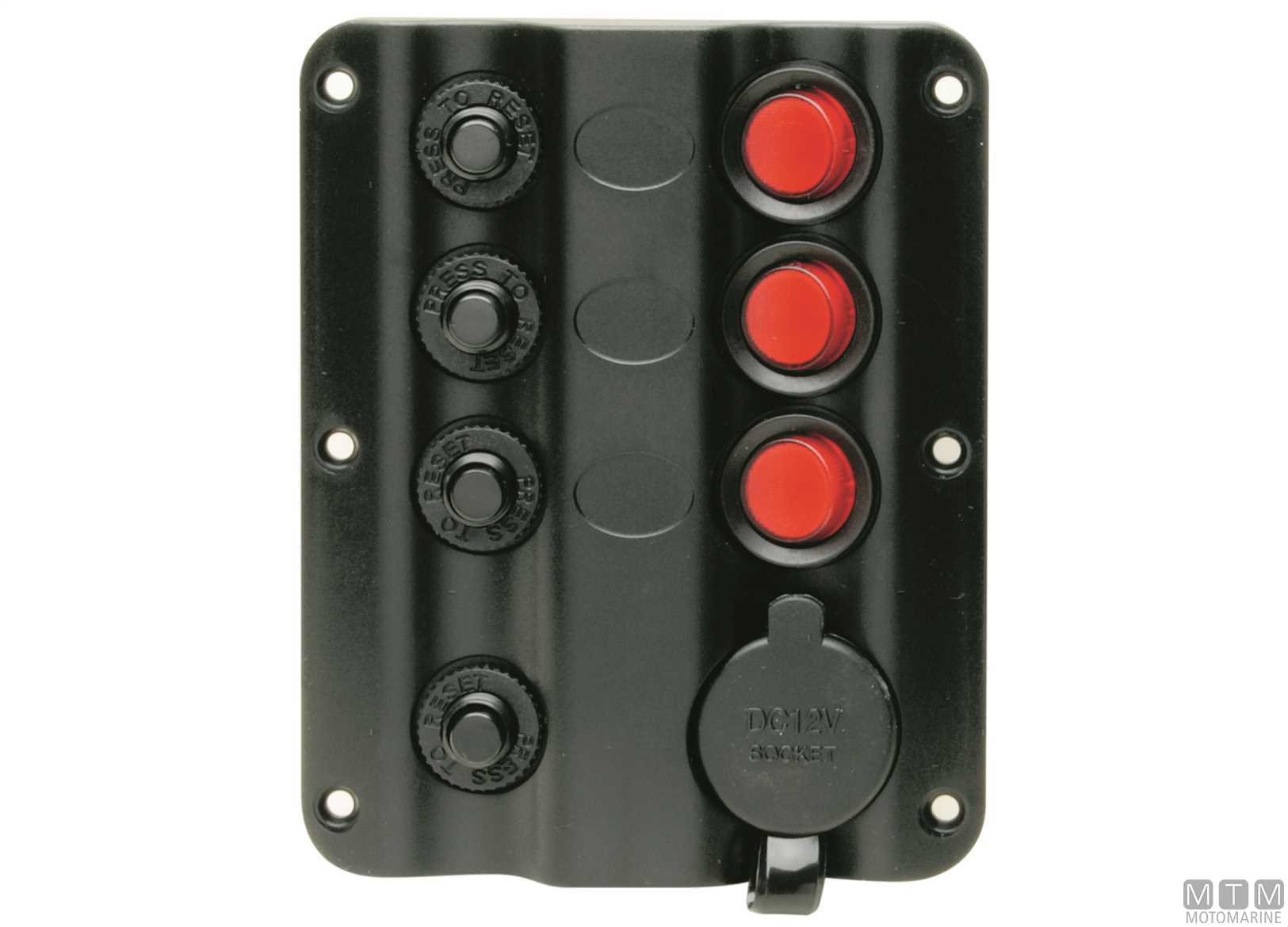 Pannello 12V in Poliuretano con interruttori impermeabili (5A, 10A, 15A), spie LED e valvole automatiche reinseribili. Completo di presa 12V e etichette prestampate.
