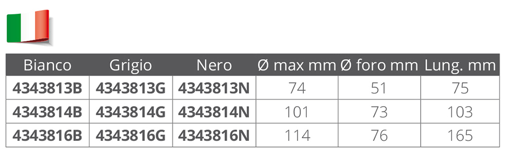 Cuffia in gomma passacavo ad incastro senza viti. Dim.: lungh. mm. 75, Ø massimo mm. 74, foro da effettuare Ø mm. 51