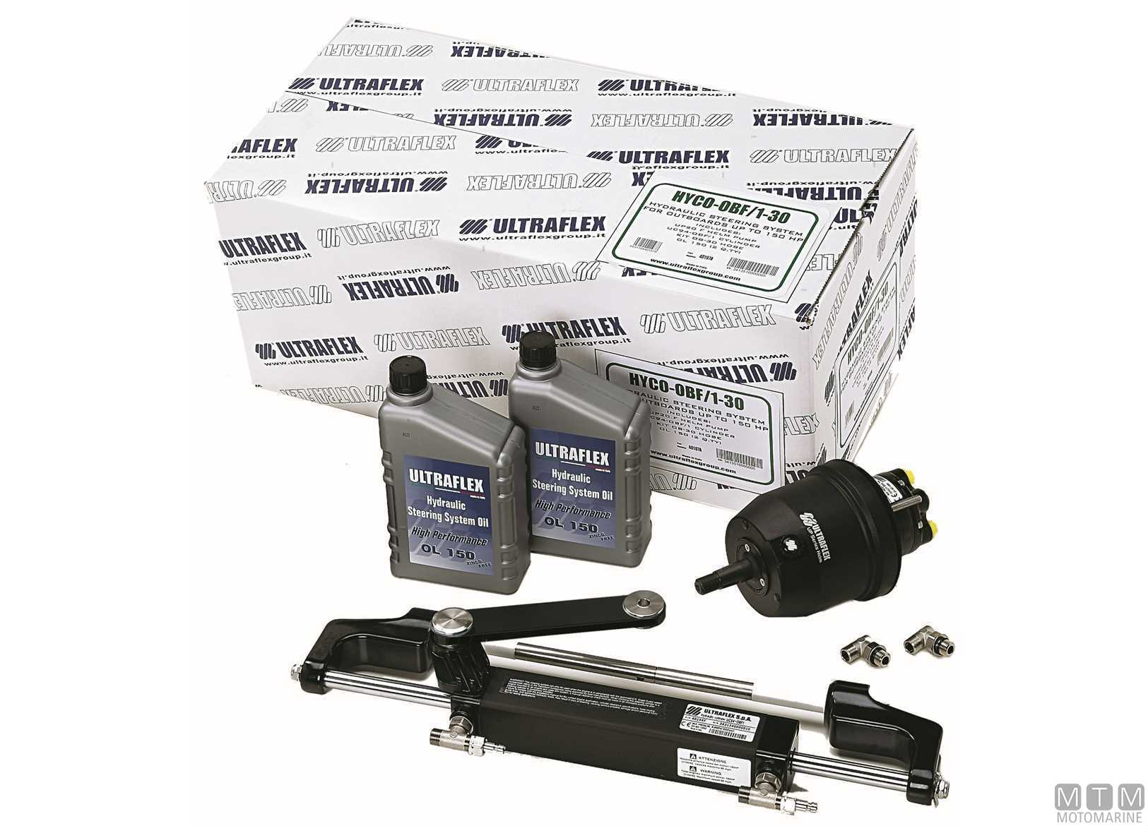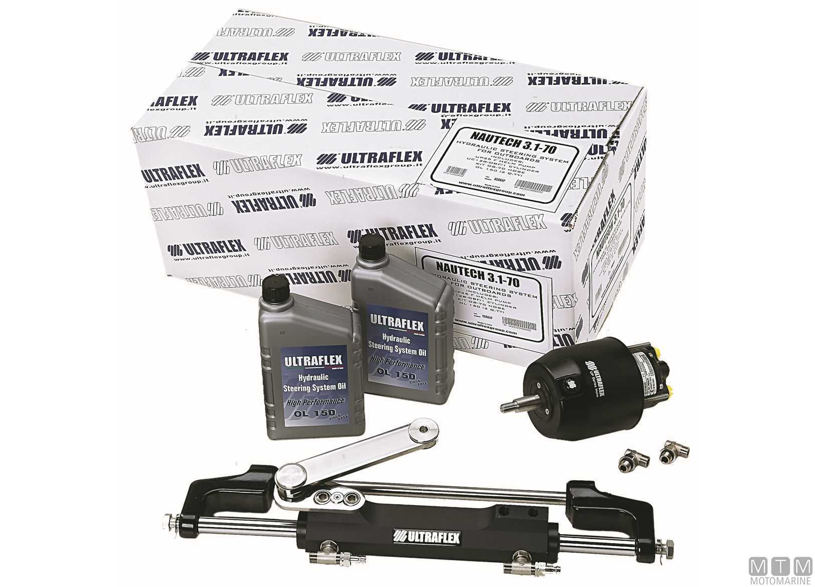 Kit timoneria Nautech1 per motori fuoribordo:↵Mercury 2 e 4T da 100 a 300 HP - Yamaha 4T da F70 a F150 e da F200 a F300 - Honda 4T 75/90/115A e da 135 a 250 HP - Suzuki 4T da 100 a 175 HP - Tohatsu 4T da 70 a 115 HP - Selva 2T da 80 a 150 e4T da 150 HP - Johnson 4T da 90 a 140 HP.↵Pratico e facile da installare, comprende:↵1 Pompa UP28F (Cod MTM 4656601), 4.3 giri volante da banda a banda↵1 Cilindro UC128-OBF/1 (Cod MTM 4655014)↵2 Litri olio idraulico Ultraflex.↵I passaparatia si utilizzano per il passaggio dei 2 tubi idraulici a poppa. Da completare con il kit di 2 tubi idraulici completi di raccordo.↵↵Kit timoneria Nautech2 per motori fuoribordo:↵Evinrude 2T da 75 a 300 HP - Yamaha 2T da 75 a 300 HP e 4T da F200 a F250 (<2007) - Suzuki 4T da 70 a 90 e da 200 a 300 HP - Tohatsu 2T da 115 a 140HP - Selva da 100 a 115 HP (<2007) - Johnson 2T da 90 a 175 e 4T da 200 a 225 HP.↵Pratico e facile da installare, comprende:↵1 Pompa UP28F (Cod MTM 4656601), 4.3 giri volante da banda a banda↵1 Cilindro UC128-OBF/2 (Cod MTM 4655015)↵ 2 Litri olio idraulico Ultraflex↵I passaparatia si utilizzano per il passaggio dei 2 tubi idraulici a poppa. Da completare con il kit di 2 tubi idraulici completi di raccordo.