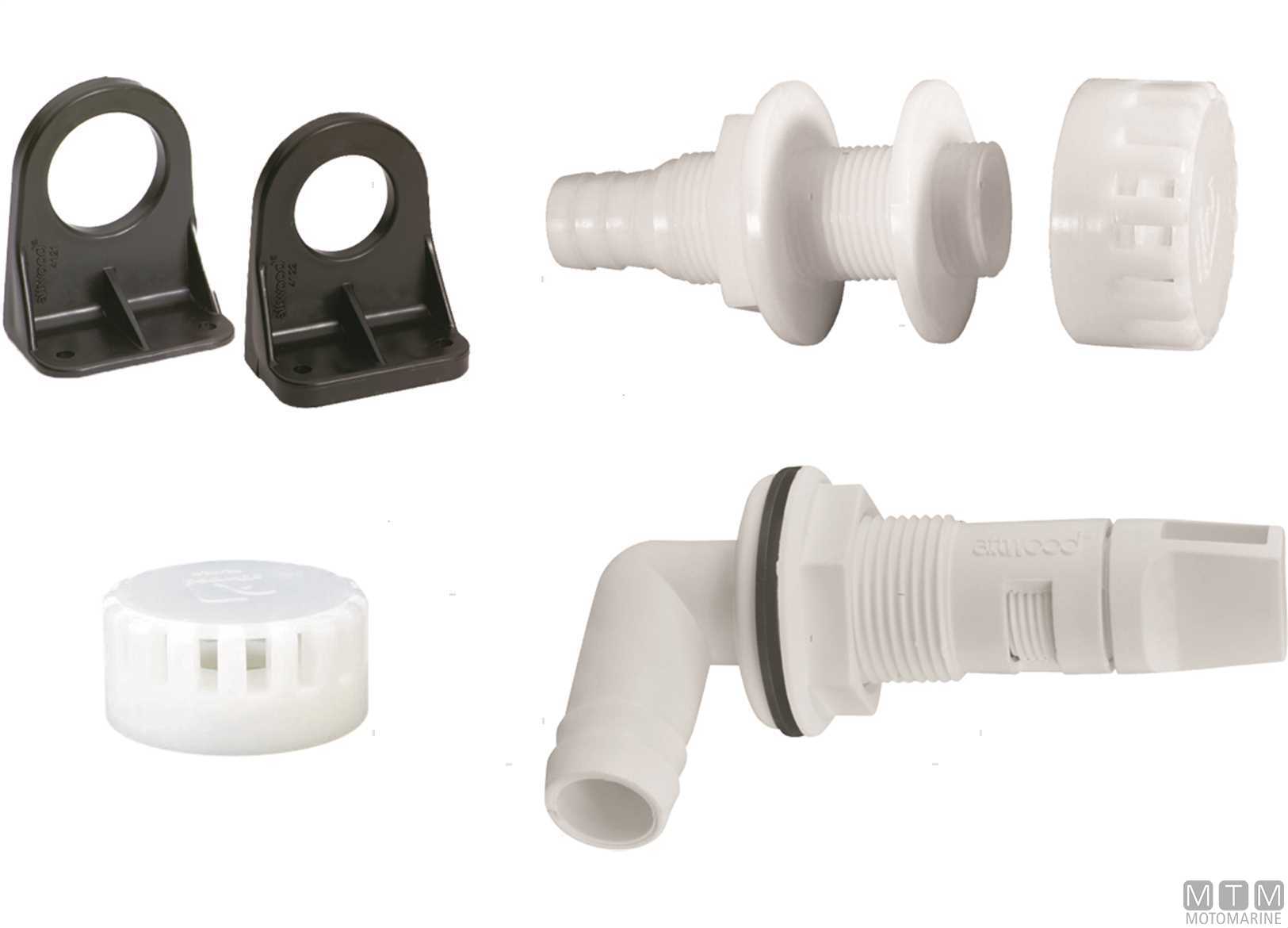Accessori e ricambi per sistemi di ossigenazione Attwood. Le staffe di montaggio permettono di montare la pompa di ossigenazione su una base. Gli spruzzatori sono regolabili con raccordo a 90°. Il passascafo con filtro previene l'ostruzione della pompa di ricircolo, spessore massimo paratia 45 mm.