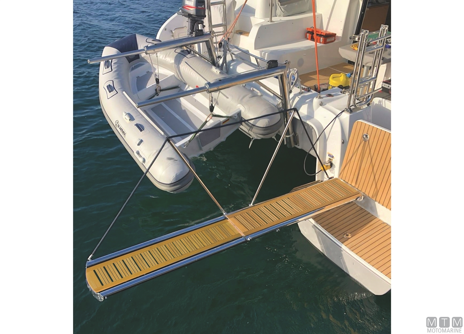 Passerella telescopica idraulica con struttura portante in Acciaio Inox tubolare AISI316L lucidato a specchio. Piano di calpestio in Teak con antisdrucciolo e luci di camminamento LED. Completa di centralina idraulica 800W e tubi da 3/8 per 3,5 metri di impianto. Si aziona con radiocomando e centralina elettronica a 10 canali cablata oppure con pannello comando a parete 127 x 87 mm completo di 10 metri di cavo. La passerella è idonea anche per sollevamento tender fino a 120 Kg.