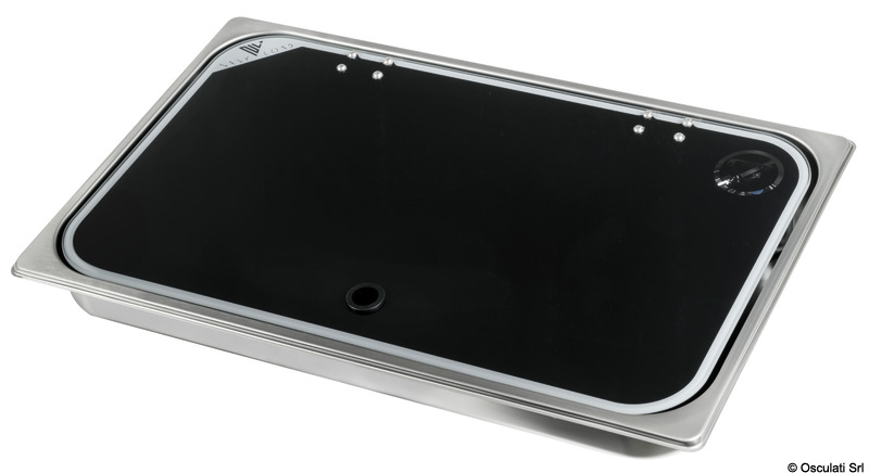 Piani cottura in acciaio inox con coperchio in vetro temperato fumé, completo di rubinetto miscelatore acqua calda e fredda.