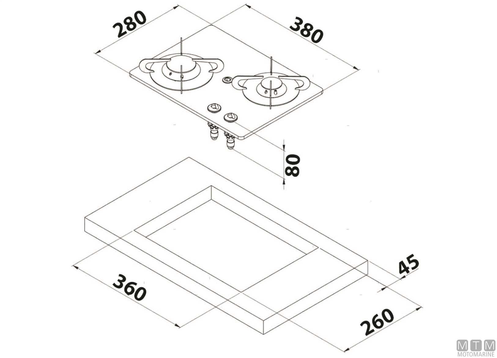 Piano a gas 2 fuochi 360 x 280 mm