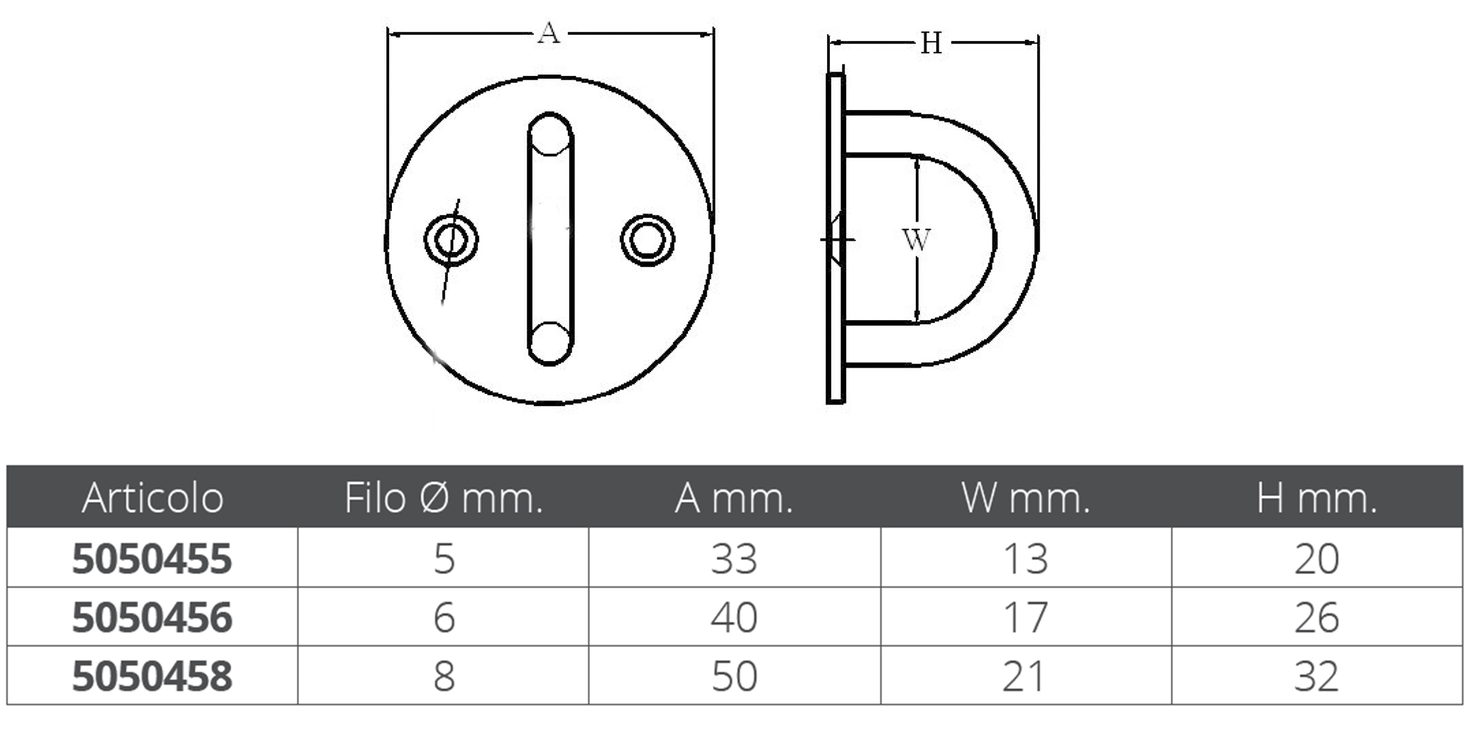 Piastra tondain acciaio inox AISI 316 con cavallotto e fori per viti, visualizza la brochure per maggiori informazioni