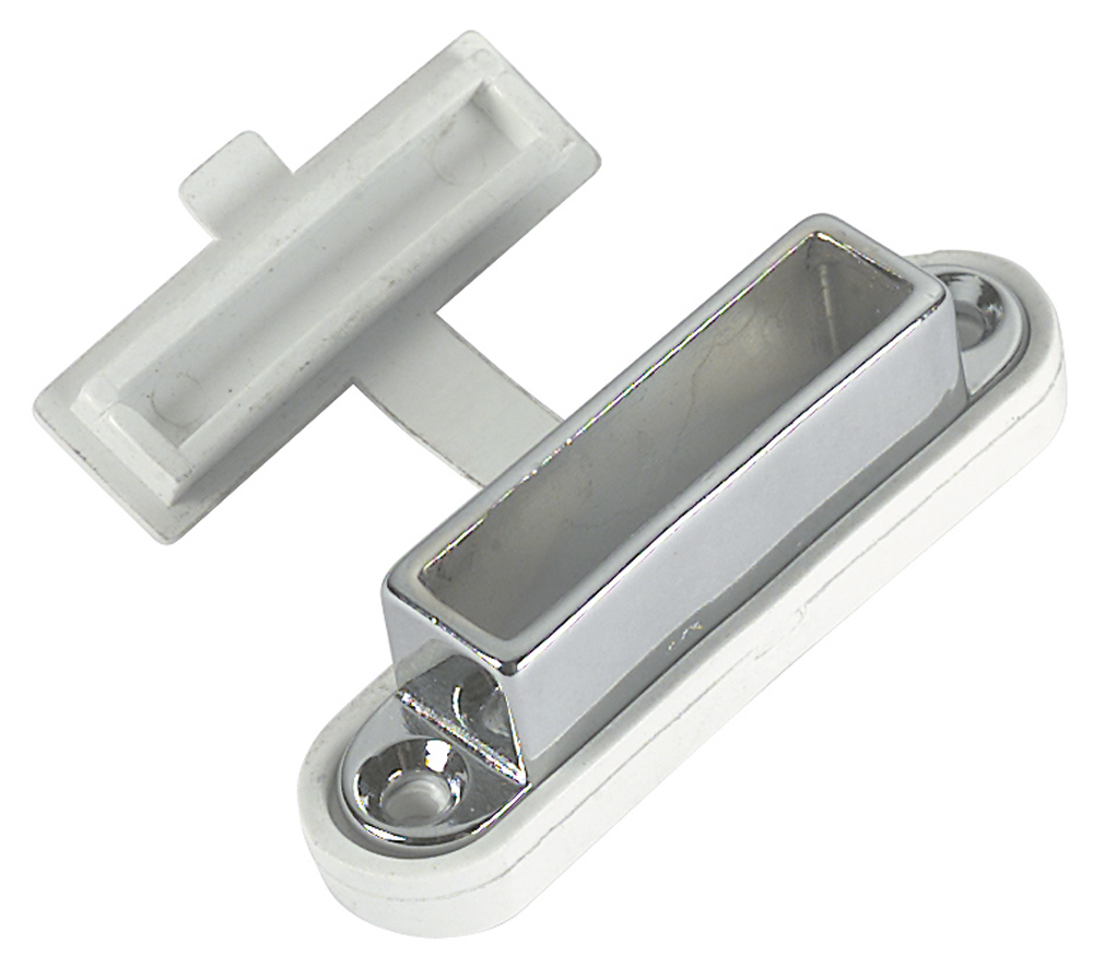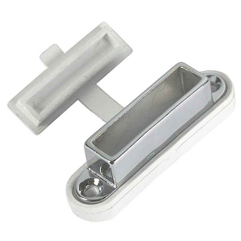Piastrina ottone cromato completa ditappo in PVC bianco. Fissaggio su basepiana. Adatta all’inserimento delle steccheper sostenere il telo della barca.Dim. cm. 67x14