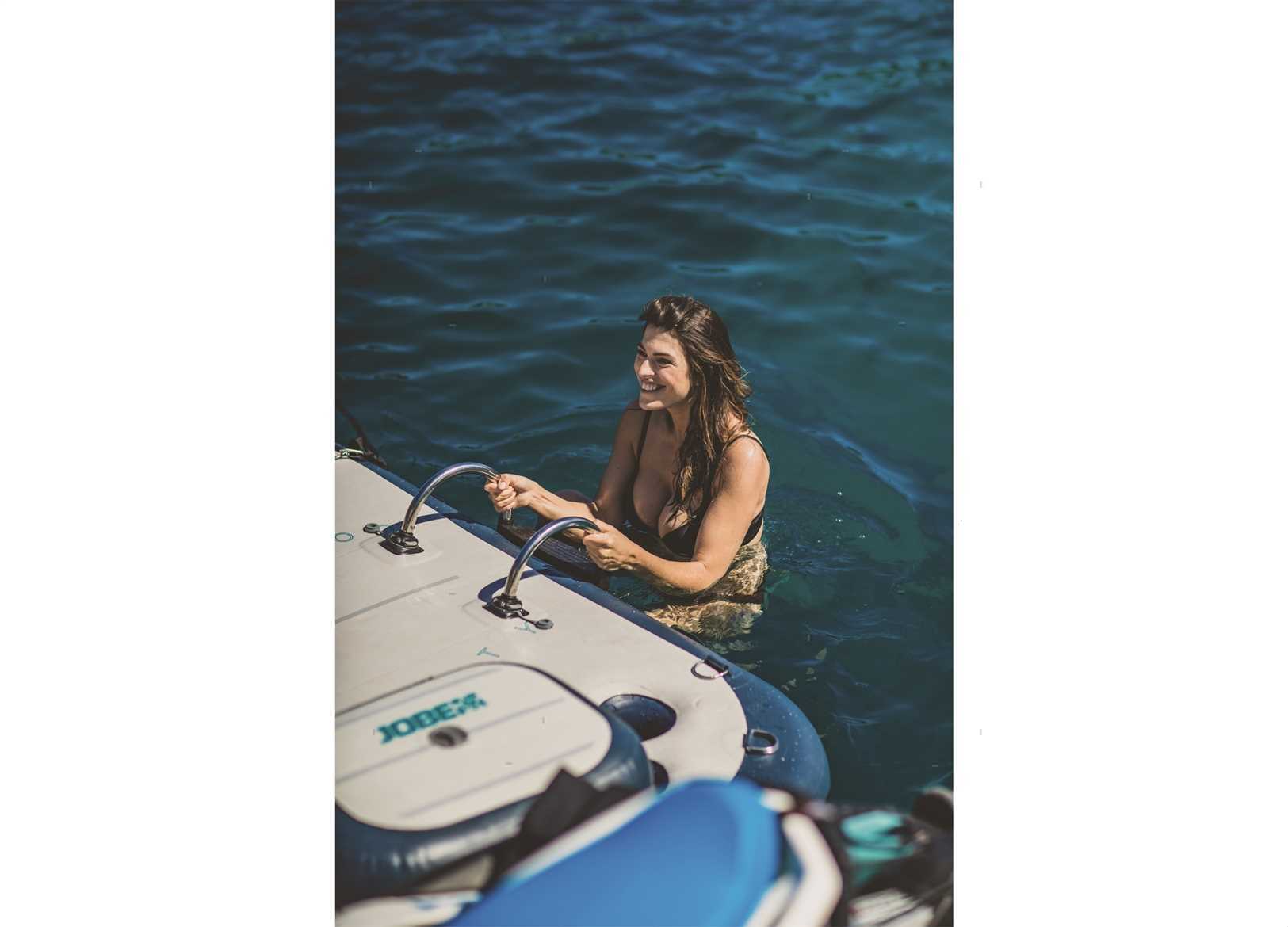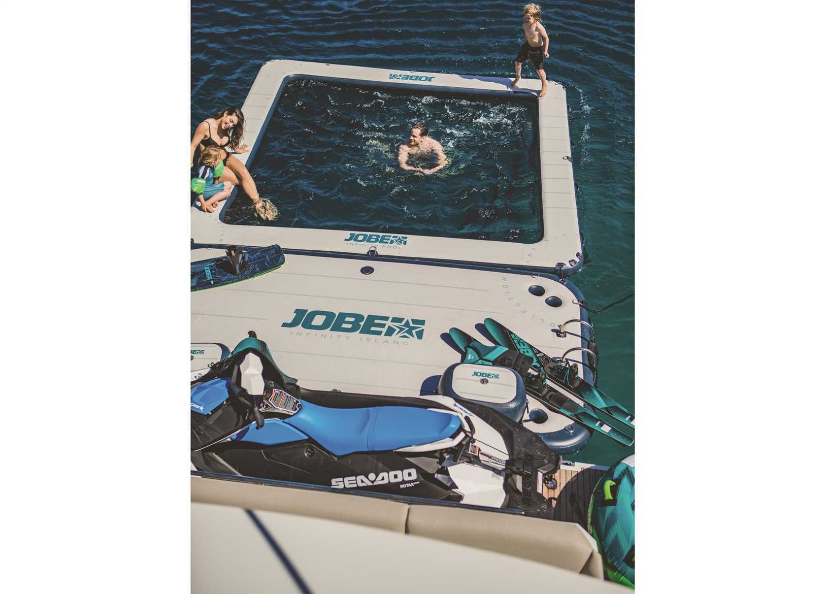Piattaforma Infinity Jobe costruita con tecnologia Heat Bonded di Nylon intrecciato e PVC con nastri di rinforzo sui bordi, con pagliolo antiscivolo in EVA. Facilmente assicurabile alla propria imbarcazione grazie ai numerosi d-rings, permette di estendere lo spazio a disposizione per numerose attività. Presenta inoltre, la possibilità di esser collegata con più piattaforme o con l'Infinity Pool (3020308) in maniera rapida e sicura. Dotata di una durevole scaletta in Acciaio Inox per la risalita, una pompa a batteria (11,6 psi) e una custodia in PVC.
