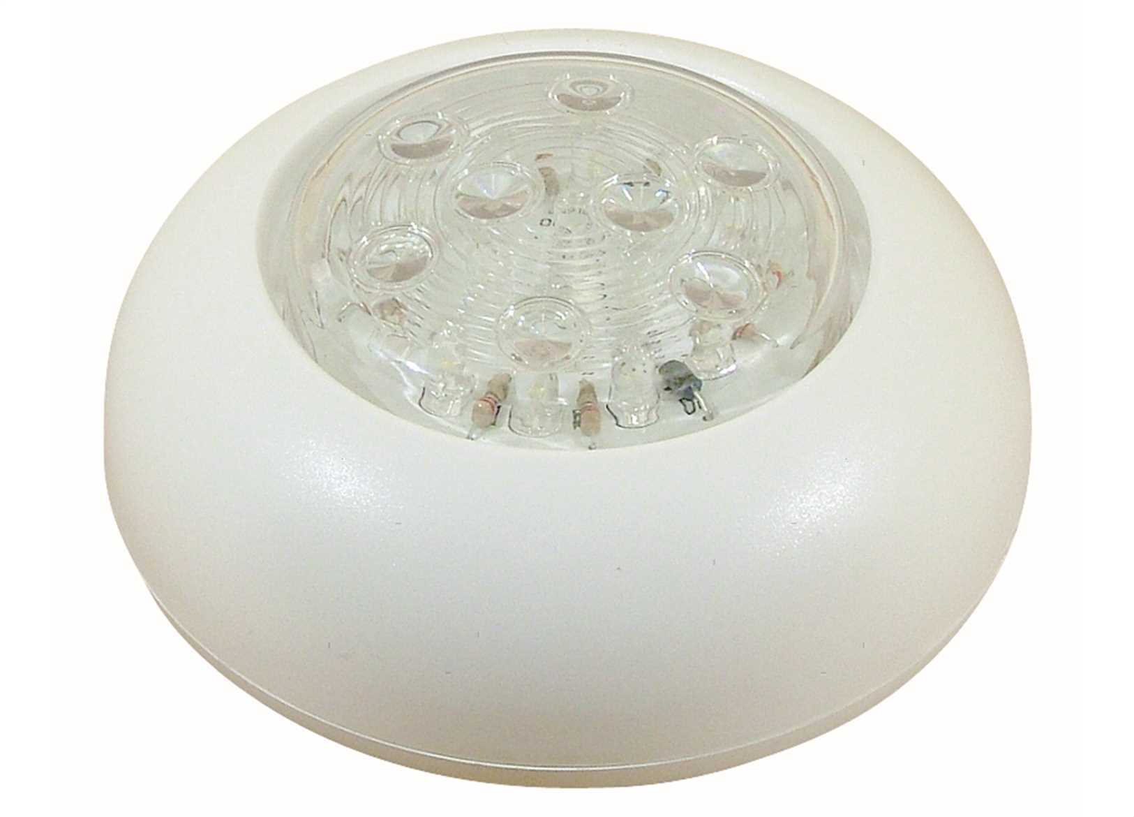 Plafoniera LED 12V con corpo in plastica bianca. Si aziona premendo la lente. ↵Luce bianca naturale 4500°K, consumo 1.15W