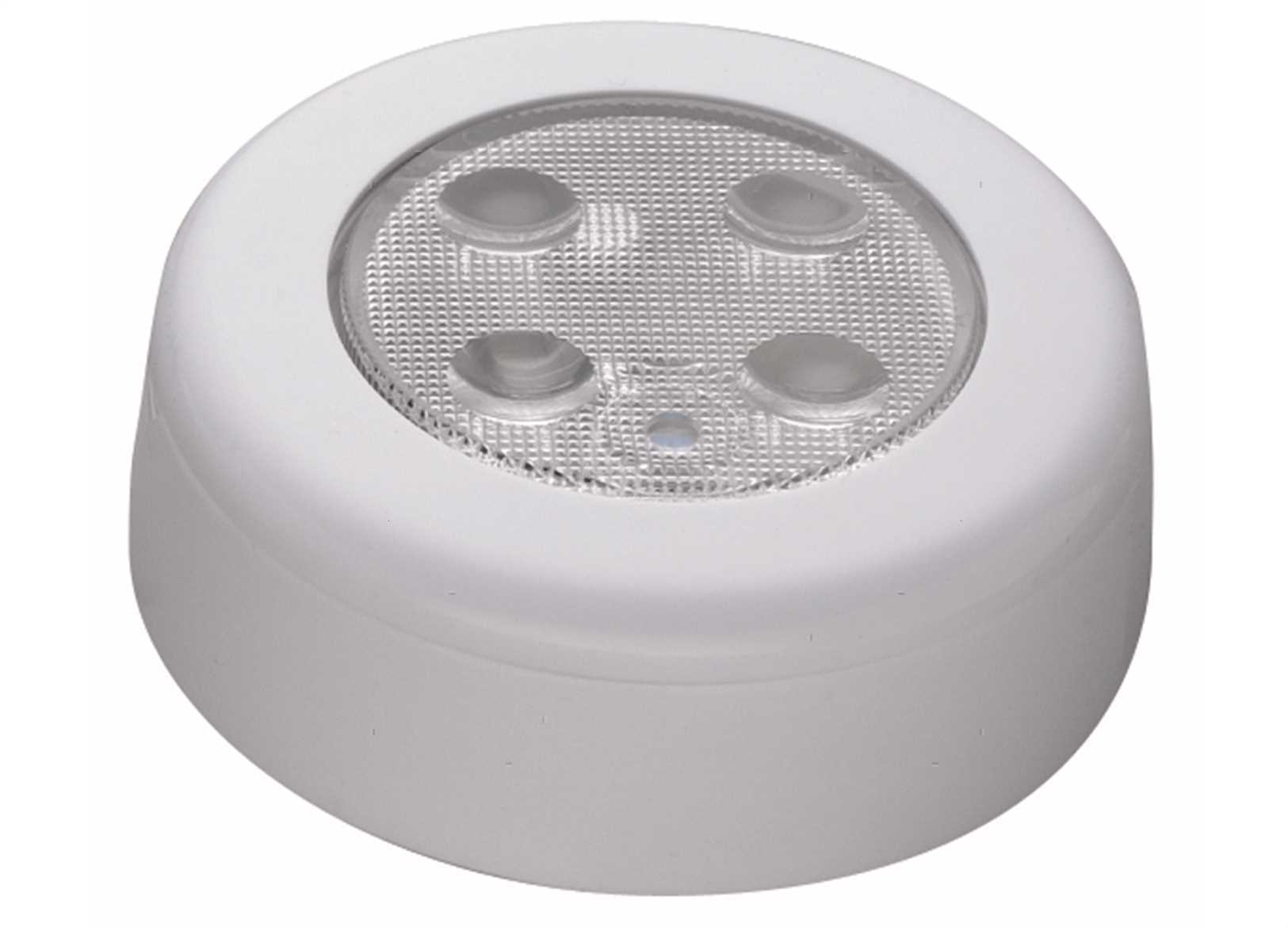 Plafoniera LED 12/24V con corpo in plastica bianca, si aziona premendo la lente. ↵Luce bianca calda 3000°K, consumo 0.8W