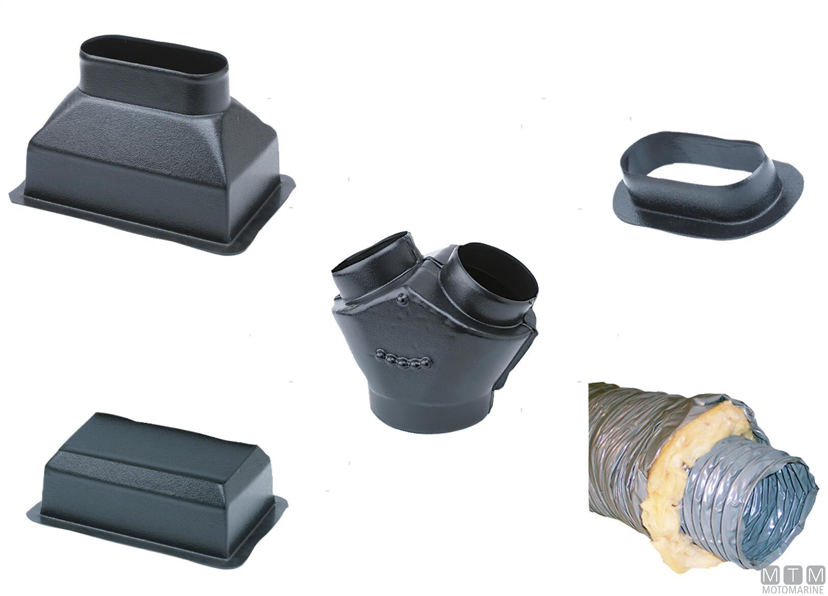 Plenum e raccordi per collegare la griglia di mandata dell'aria all'impianto di condizionamento. Il plenum a Y viene usato per fare una seconda linea di mandata. La condotta aria in PVC coibentato è flessibile a sezione deformabile per poter essere facilmente collegata all'anello fissatubo del plenum. L'anello fissatubo viene fornito di serie sui plenum piccoli, va acquistato separatamente sui modelli più grandi.