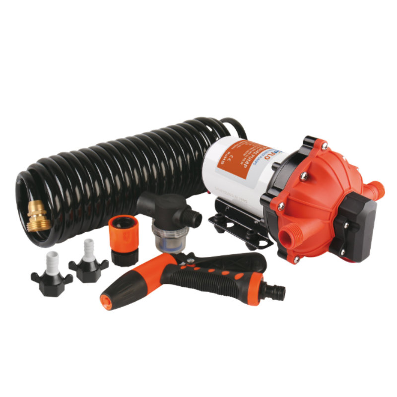 Questa pompa di lavaggio autoadescante offre una gestione automatica della portata e della pressione, ottimizzando il consumo energetico e garantendo prestazioni sempre efficienti. La valvola by-pass integrata riduce l’effetto pulsante e rende il funzionamento notevolmente più silenzioso, mentre i piedini in gomma proteggono da corrosione e vibrazioni. Il motore è dotato di protezione termica che interviene in caso di surriscaldamento accidentale e permette alla pompa di lavorare anche a secco senza subire danni. Le cinque membrane in Santoprene assicurano un flusso costante e regolare, ideale per il lavaggio di imbarcazioni, vasche del vivo, ancore, battelli, camper e roulotte. Il kit include filtro, raccordi portagomma, tubo flessibile resistente ai raggi UV e una lancia di lavaggio con attacco automatico.