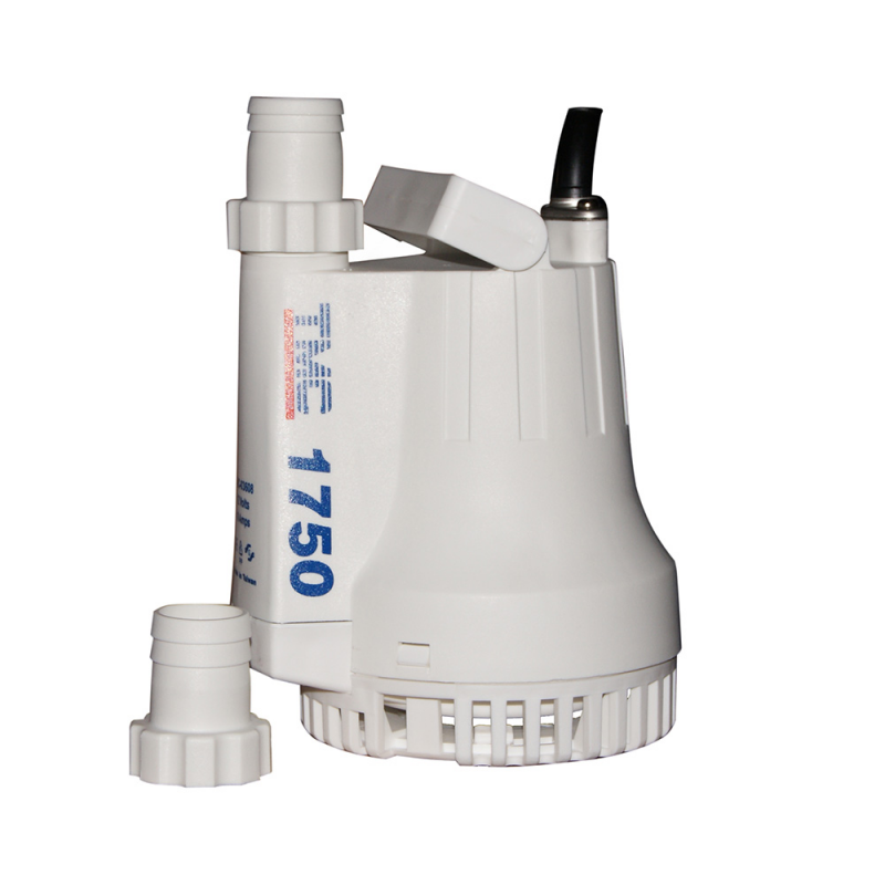 TMC 1750 - Portata 6700 lt/ora. Prevalenza mt. 3,3 Consumo 10 Ah/ora, alimentazione 12 V., completa di due portagomma Ø mm. 28,5 e Ø mm. 25. Altezza pompa mm. 190, base Ø mm. 120