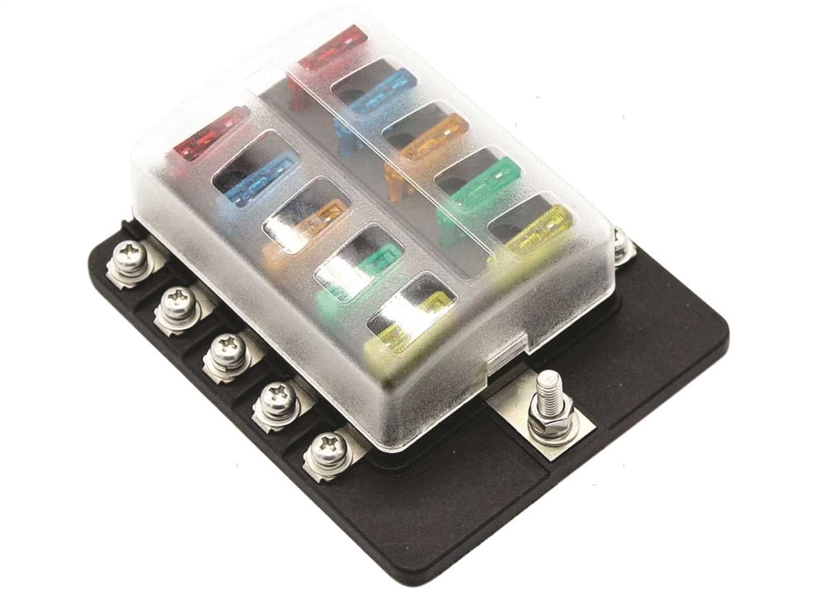 Scatola portafusibili lamellari standard (Unival) con positivo comune.↵ Indicatore LED di allarme che si attiva in caso di fusibile interrotto.↵Copertura di protezione trasparente. Etichette adesive con simboli utenza.↵ Terminali a vite per una maggiore sicurezza.