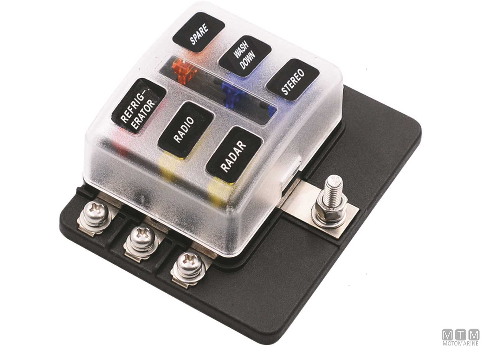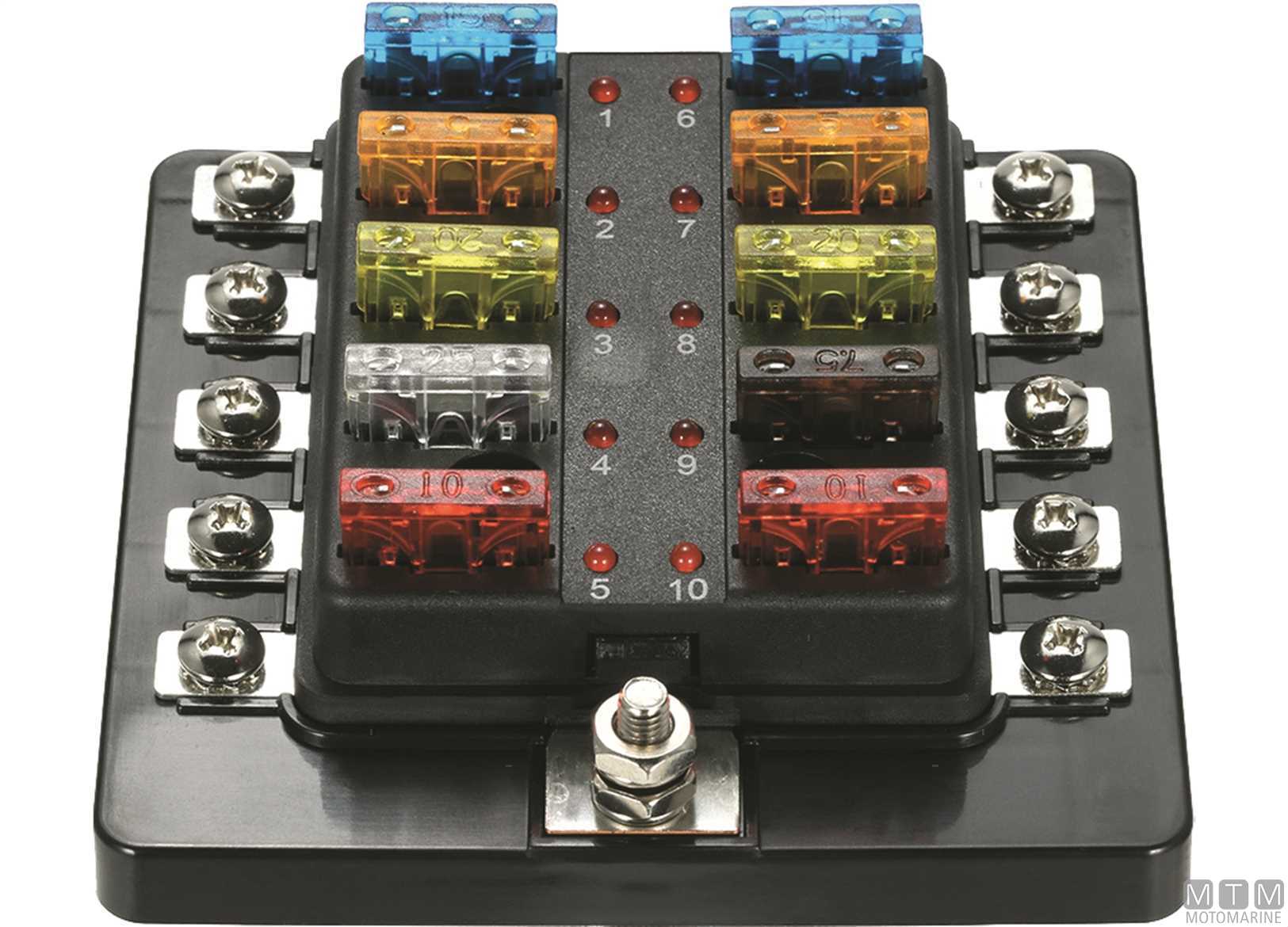 Scatola portafusibili lamellari standard (Unival) con positivo comune.↵ Indicatore LED di allarme che si attiva in caso di fusibile interrotto.↵Copertura di protezione trasparente. Etichette adesive con simboli utenza.↵ Terminali a vite per una maggiore sicurezza.