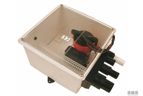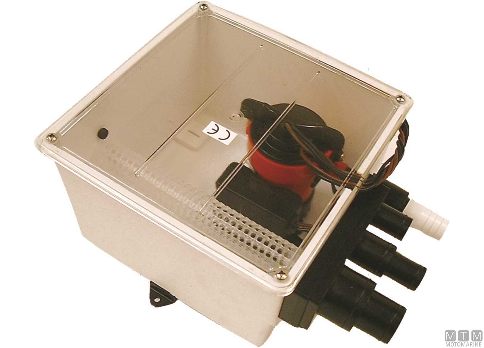 Pozzetto raccolta acque grigie e scarico doccia Johnson con pompa automatica di scarico e coperchio con guarnizione a tenuta stagna. Bocca di scarico: 3/4"(20 mm)↵3 Bocchette di aspirazione: ↵3/4"(20 mm)↵3/4"(20 mm) modificabile a 1"(25 mm)↵1 1/8"(30 mm) modificabile a 1 1/2"(38 mm)↵