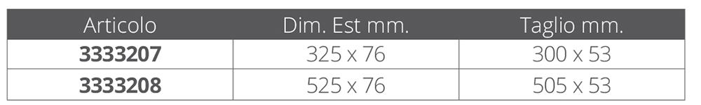 Prese aria in acciaio inox lucidato a specchio, incasso mm. 27.Art. 3333207 dim. est. mm. 325x76taglio mm. 300x53, art. 3333208dim. est. mm. 525x76taglio mm. 505x53