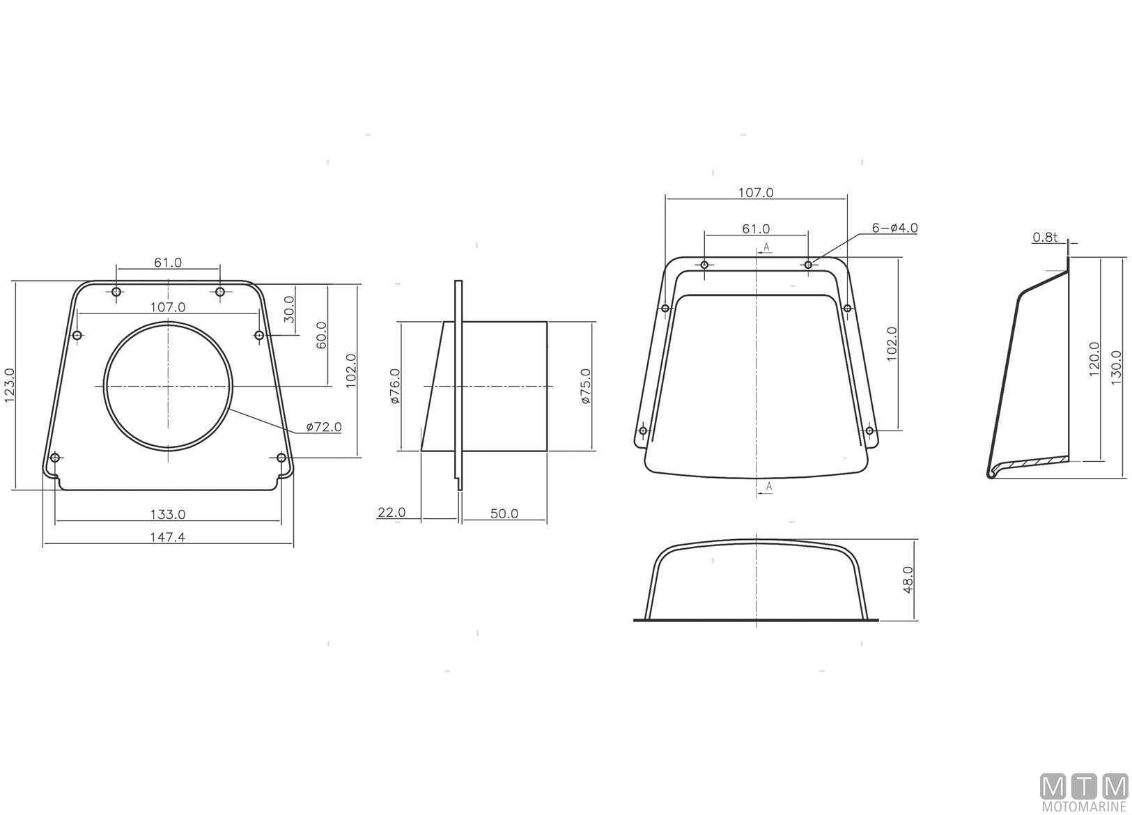 Presa d'aria in Acciaio Inox lucidato a specchio con grande bocca di ventilazione e attacco per tubo convogliatore aria ø 75 mm. Altezza su coperta 55 mm.