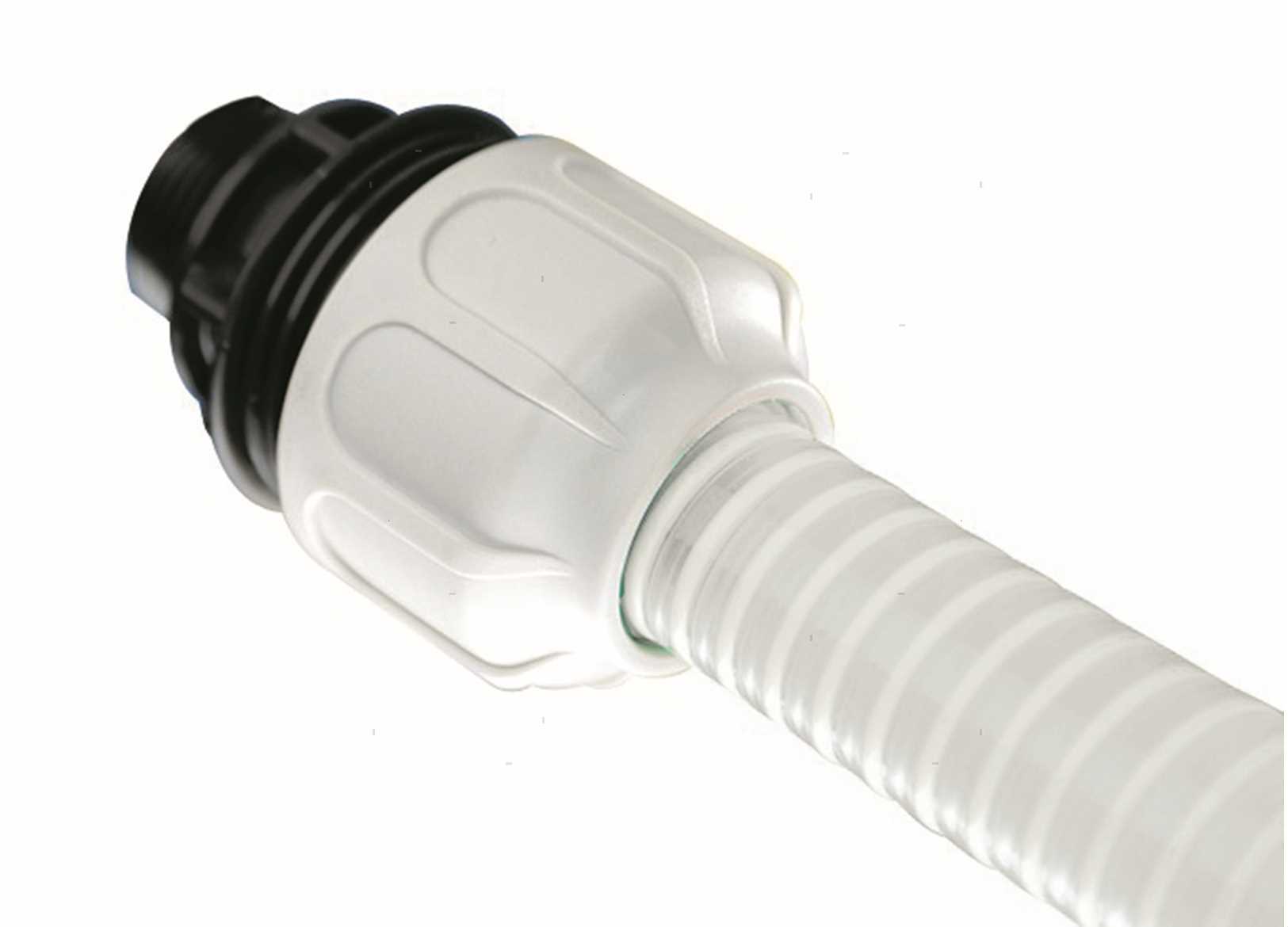 Raccordo a innesto rapido in Polipropilene caricato. Connette velocemente qualsiasi tipo di tubo flessibile, anche spiralato e corrugato. Elimina la fascetta stringitubo. Tenuta stagna fino a 10 bar.