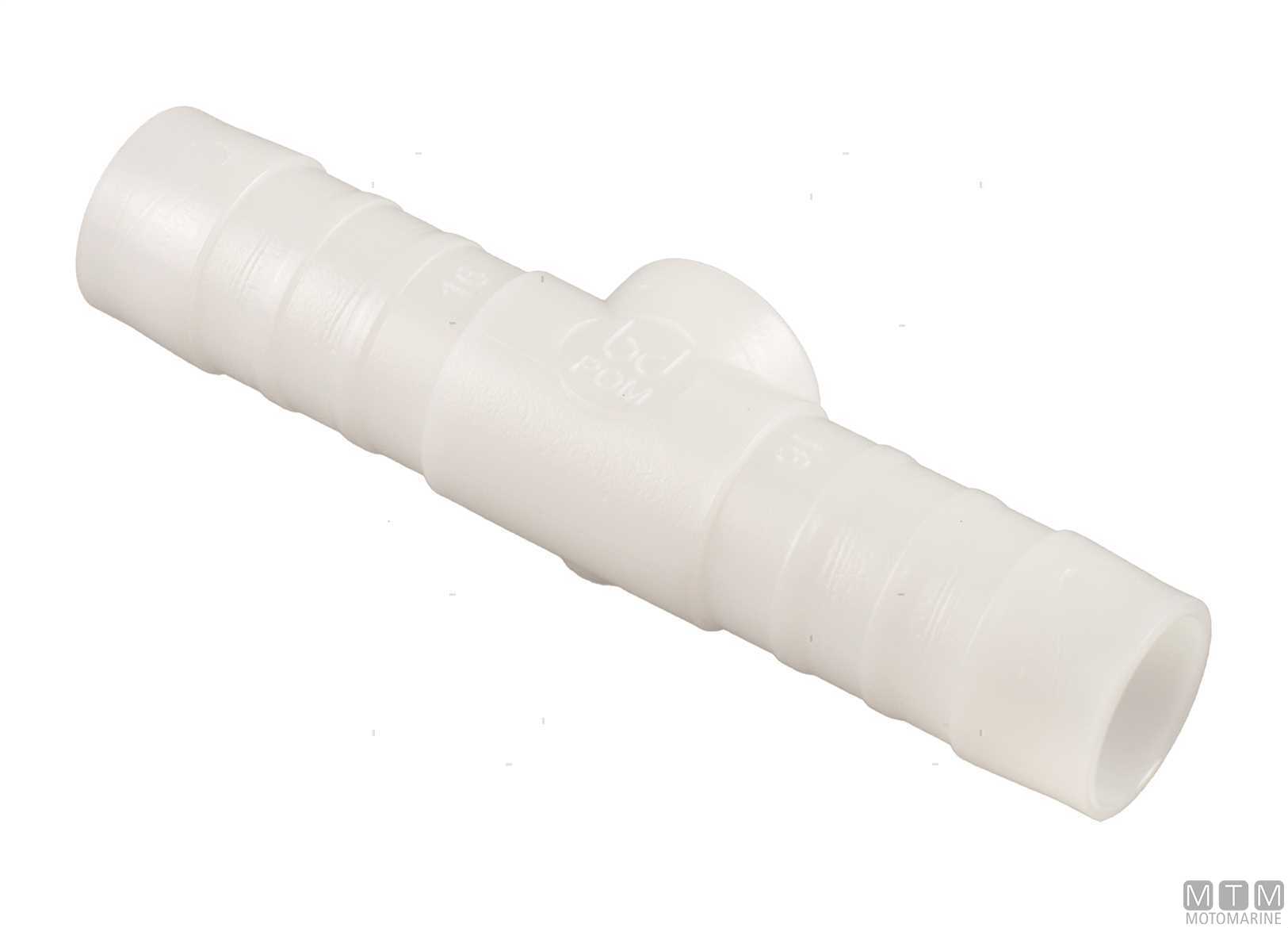 Raccordo portagomma in Polimero di Resina Acetalica per impianti di acqua dolce, di scarico e di mare. Passaggio interno dei fluidi liscio senza spigoli con pareti a spessore per resistere agli urti, assenza di corrosione, pressione di esercizio 10 bar a max 85 °C.
