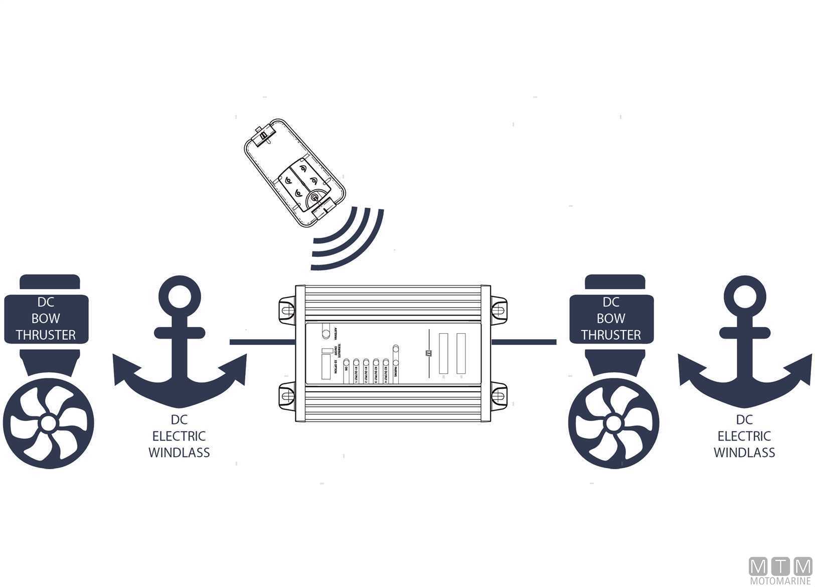 Radiocomando wireless per controllare qualsiasi apparecchiatura di bordo elettrica con comando on-off e con comando proporzionale. Comprende centralina 12/24V e telecomando a 4 tasti che funziona fino a 15 metri di distanza. La centralina può essere collegata fino a due dispositivi come eliche di manovra, verricelli salpa ancore oppure attivatori idraulici. Include due cavi a 4 poli da 10 cm ciascuno per collegamenti con comando on-off. I collegamenti con comando proporzionale richiedono cavi V-CAN ed eventuale hub CAN da acquistare separatamente.