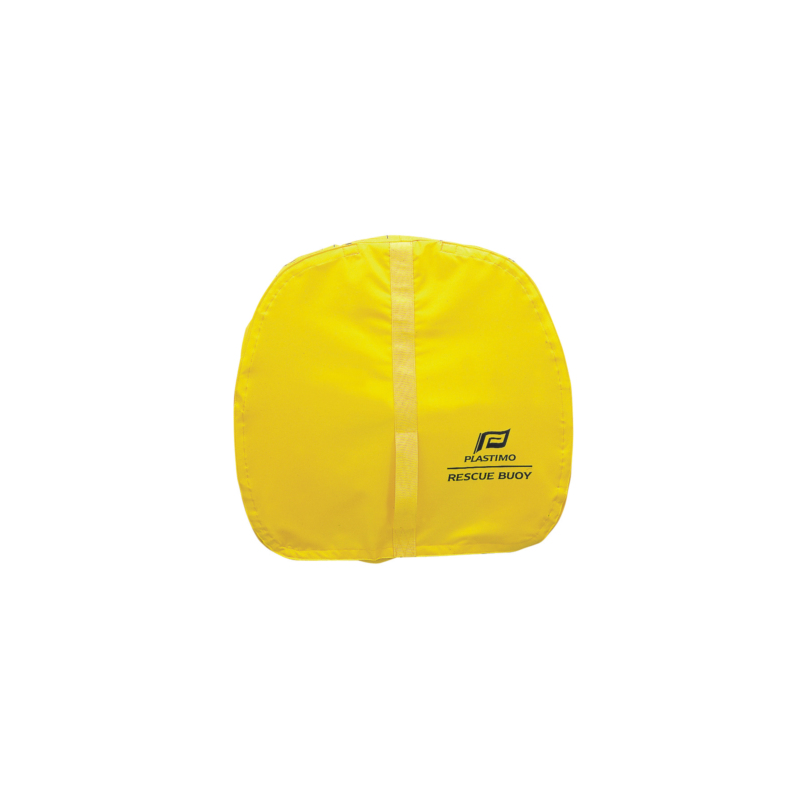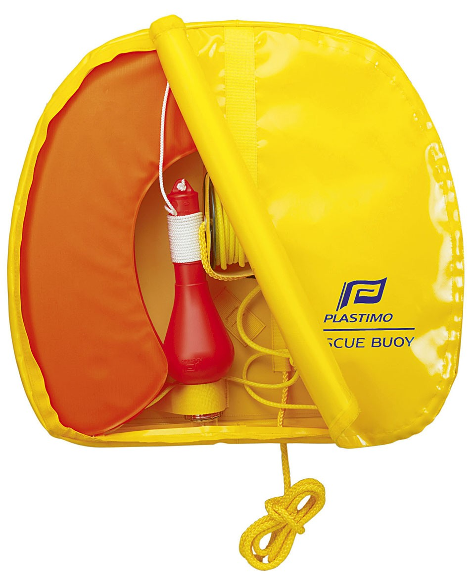 Salvagente a ferro di cavallo con fodera saldata completo di 40 mt. di sagola, boetta luminosa e supporto rivestito in tela. Galleggiabilità 147 N, dim. cm 60x65x14 peso kg. 2,50