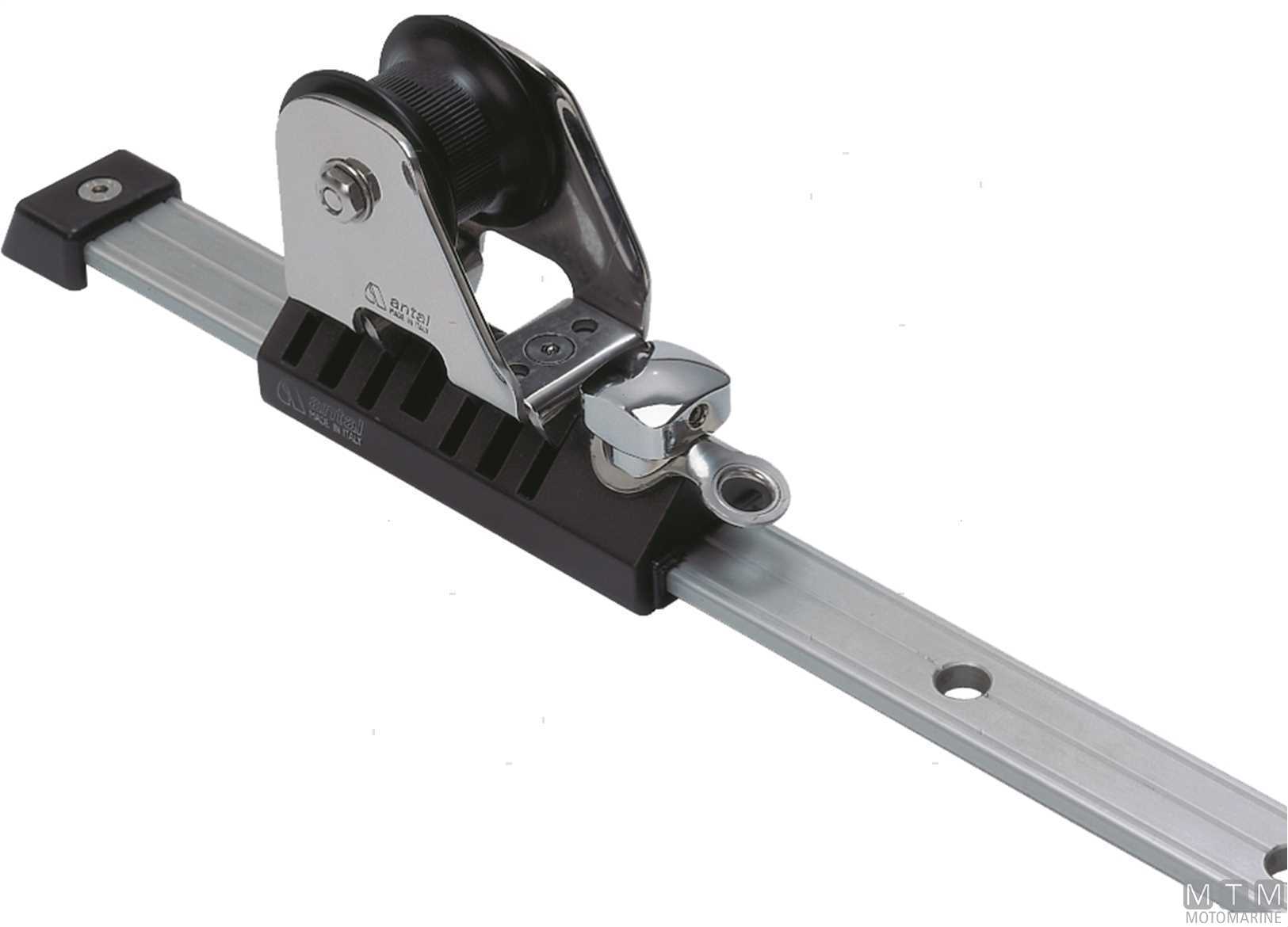 Carrello in Alluminio ossidato Nero su pattini in Nylon a basso attrito. Supporto puleggia in Acciaio AISI 316 orientabile (± 50°). Puleggia in resina con doppio cuscinetto laterale a sfere (self/captive) a sezione allargata per il passaggio della doppia scotta. Fermo d’arresto in Acciaio AISI 316 con posizione di disinserimento. Arricavo frontale. ↵Carico di lavoro (SWL) 2800 Kg. ↵↵Rotaia a T passo foratura 100 mm. ↵Profilo in Alluminio ad alta resistenza anodizzato. ↵Fissaggio con viti da 6 mm.