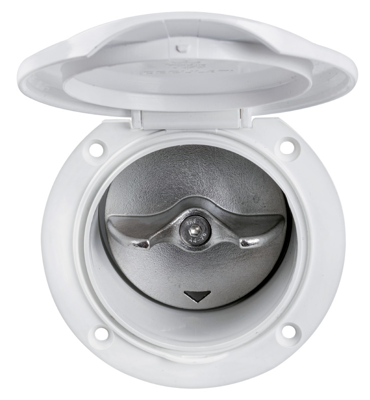 Rubinetto a 3 vie per collegare due serbatoi ad un motore. Tre posizioni tank 1 / tank 2 / chiuso.