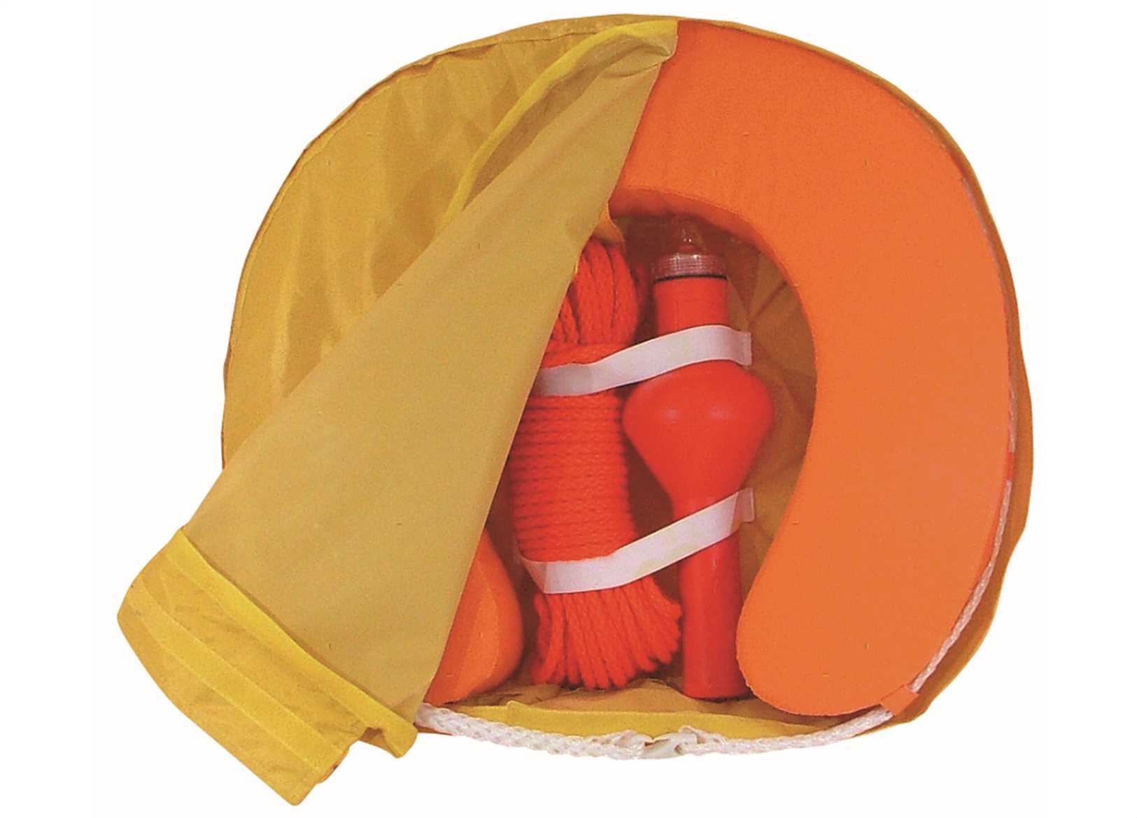 Salvagente a ferro di cavallo con copertura levabile a cerniera. Completo di boetta MED e sacca impermeabile di protezione con sistema di attacco. Non omologato.