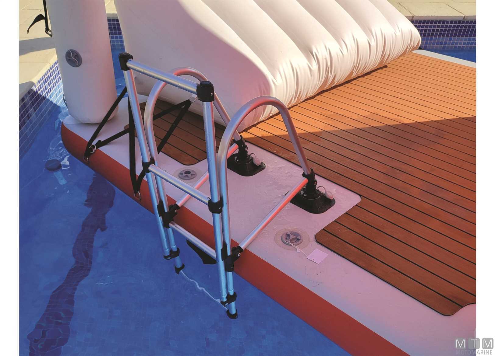 Resistente piattaforma galleggiante in rete di Poliestere Dropstich ad alta resistenza spalmata PVC con struttura interna a nido d'ape. Si può gonfiare e sgonfiare e può essere facilmente piegata con ingombro minimo. Completa con pagliolo antiscivolo in EVA e d-rings in Acciaio Inox per essere assicurata all'imbarcazione oppure ad altre strutture galleggianti o banchine. Può essere usata come piattaforma ricreativa, come materassino d'acqua oppure come piattaforma da manutenzione per lo scafo. Scaletta opzionale in Alluminio 3 gradini facilmente amovibile grazie alle piastre attacco già presenti sui modelli 200/400, da incollare invece sul modello 150.