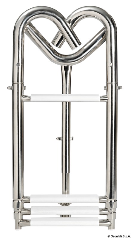 Realizzata in acciaio inox AISI 316 lucidato a specchio. I bracci sono girevoli e si agganciano al pulpito. Caratteristiche tecniche: scaletta telescopica con gradini ovali rivestiti in plastica bianca; bracci di aggancio girevoli; puntone di appoggio alla prua telescopico.