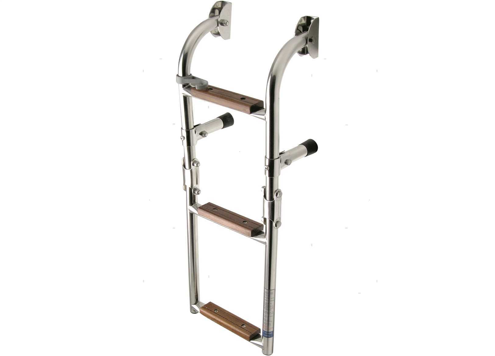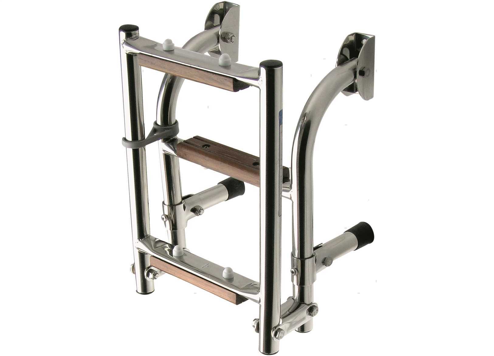 Scaletta pieghevole in Acciaio Inox con interasse stretto. ↵Gradino rivestito con Legno trattato. ↵Si usa quando manca spazio sullo specchio di poppa.