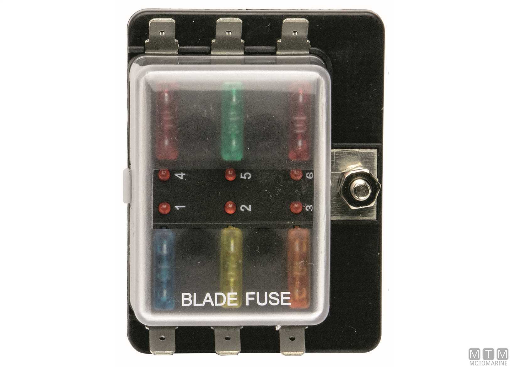 Scatola portafusibili lamellari standard (Unival) con positivo comune.↵ Indicatore LED di allarme che si attiva in caso di fusibile interrotto.↵Copertura di protezione trasparente. Etichette adesive con simboli utenza.↵ Terminali a Faston per una maggiore praticità.
