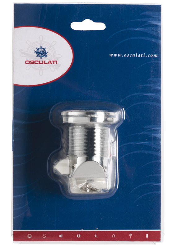 In zama cromata, completo di battuta in nylon. Quando il pomolo è inserito a filo si innesta la sicura che non permette l’apertura dello sportello. Premendo il pomolo lo si fà fuoriuscire ed in tal caso si sblocca la sicura.