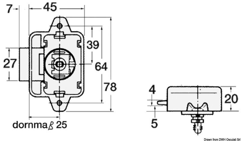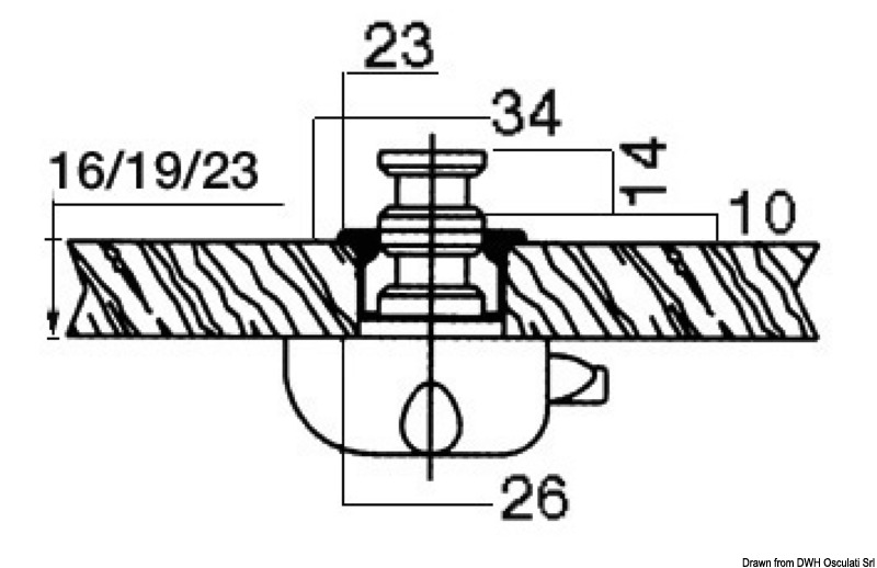 Per chiudere si preme il pulsante che resta a filo, per aprire si ripreme il pulsante che esce sbloccando le antine e costituendo nello stesso tempo un pomello di presa. Montaggio dello scrocco con 2 viti e della ghiera dall’esterno con un foro Ø 26 mm. Corpo scrocco in nylon, molle inox.