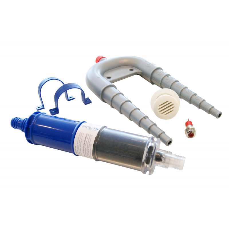 Serbatoio acque nere e grigie in plastica completo di impianto per lo svuotamento con pompa autoadescante JABSCO 12V, portata 19 lt/min, portagomma entrata/uscita Ø mm. 38. Dim:mm.650X290X390h, peso kg.7
