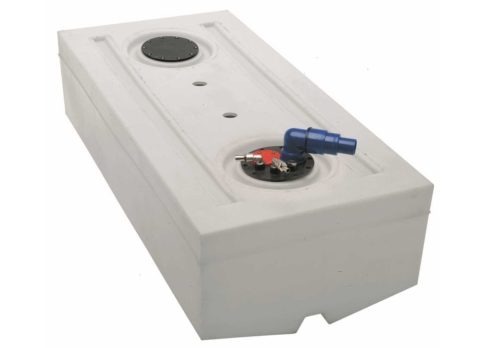 Serbatoio sagomato a fondo barca in Polietilene reticolato completo di boccaporto con sfiato da 17/19 mm, uscita con pescante da 12 mm e bocchettone di carico da 38/50/60 mm. Certificazione CE-ISO21487.