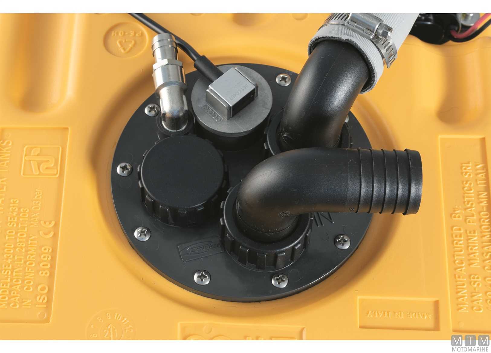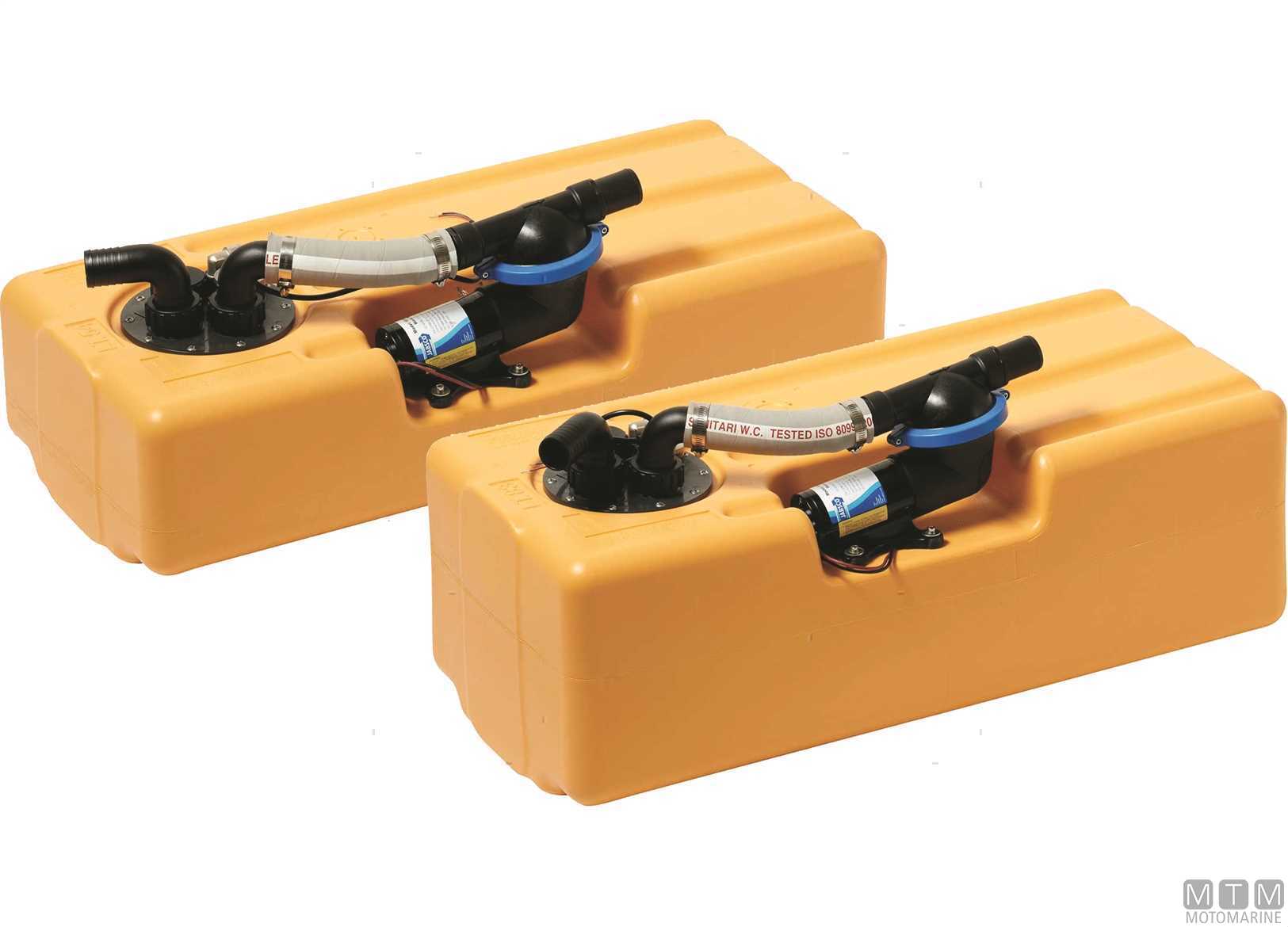 Serbatoi acque nere/grigie in Polietilene ad alta densità con impianto per lo svuotamento. Completi di pompa autoadescante Jabsco 12V con raccordo 38 mm, boccaporto a 10 fori, portagomma girevole 38 mm, portagomma 16 mm in Acciaio Inox, sensore livello tubolare 240-33 Ohm, filtro antiodore con passascafo di sfiato e sifone di scarico.
