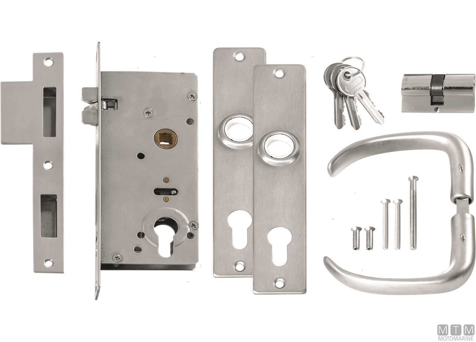 Serratura da infilare con chiavi, maniglie e scontro piano incassato. Corpo in Ottone Cromato, componenti inossidabili e scivolo antivibrante.