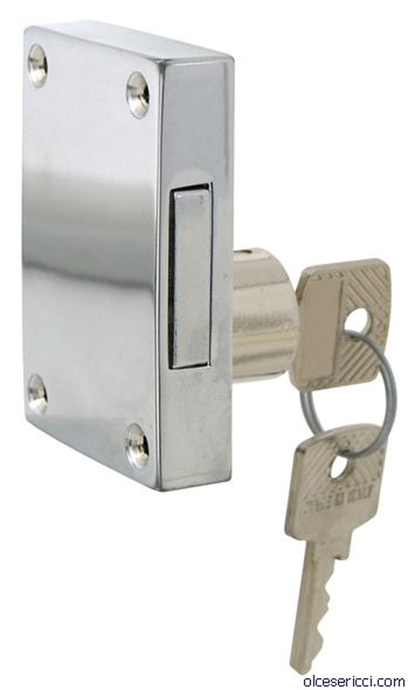 Serrature in ottone cromato quadro mm. 8 da appoggio, ad una mandata, misura mm. 60 x 40, cilindro Ø mm. 20, sporgenza cilindro mm. 15.