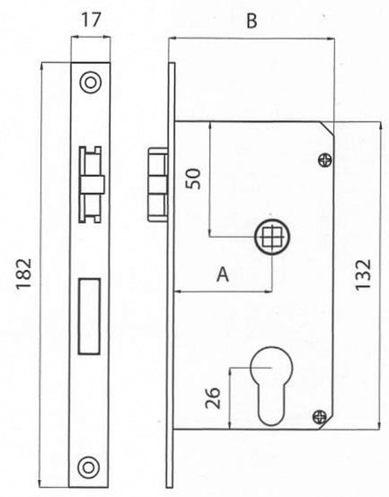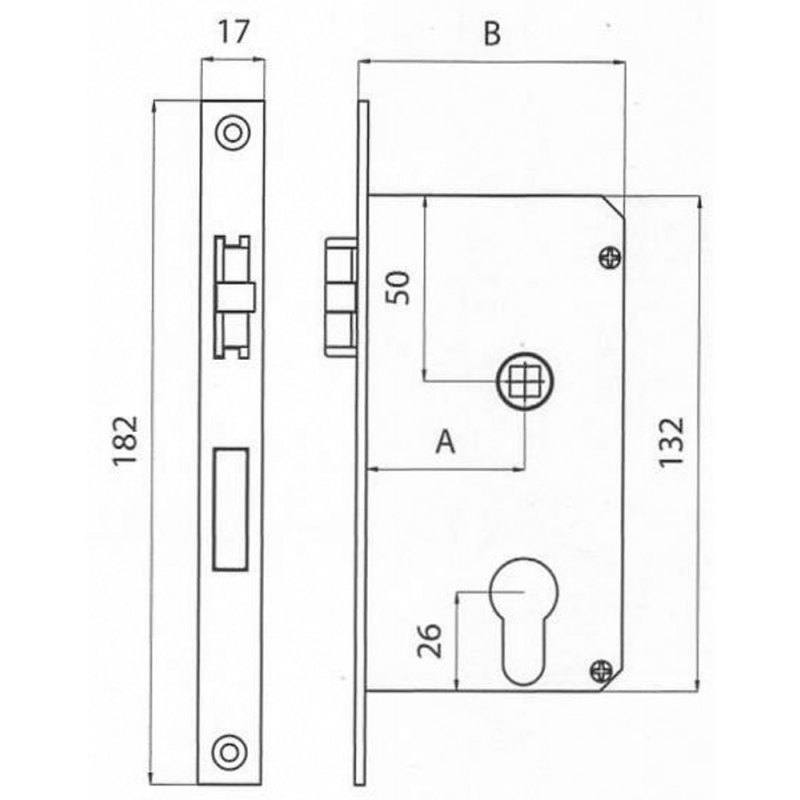 Serratura da incasso in ottone cromato a scrocco antivibrante, con cilindro.Incasso mm. 132 x 70.Quadro mm 8