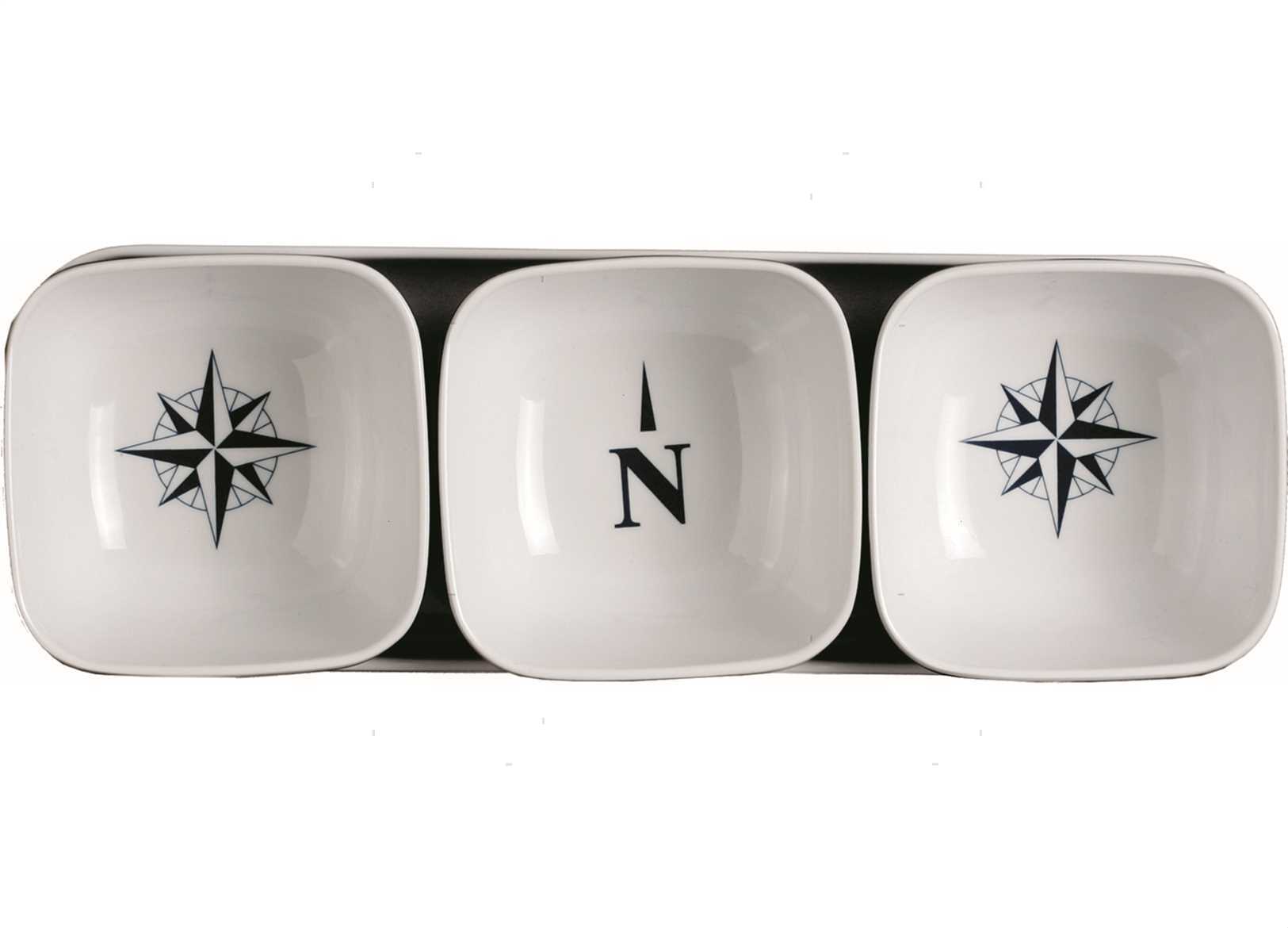 Set di 3 ciotole snack con sottopiatto rettangolare con decoro Northwind. In Melamina garantita 100% per uso alimentare. Lavabile in lavastoviglie, infrangibile e anti-macchia.