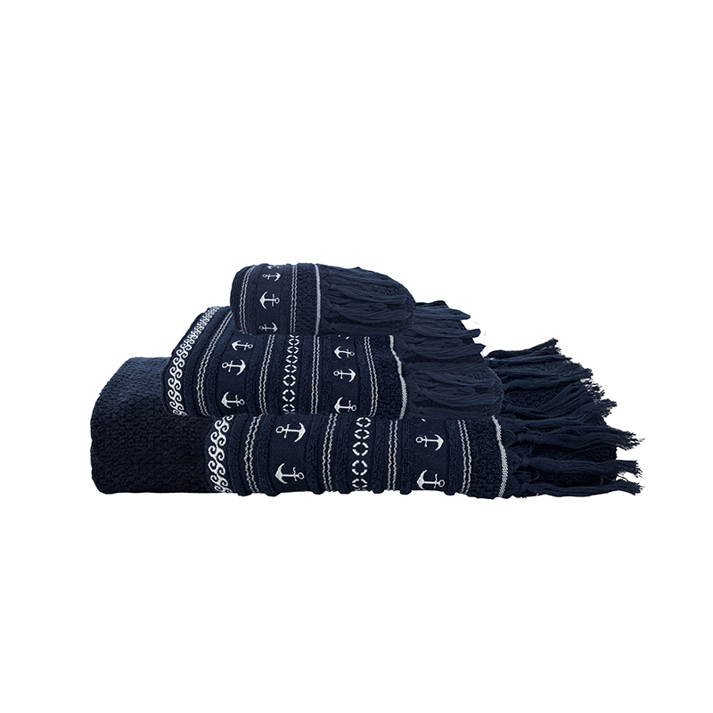 Vellutati al tatto, con tessiture e ricami, gli asciugamani da viso, doccia e bidet di questa elegante collezione sono ideali per dare un leggero tocco nautico al bagno di qualsiasi imbarcazione.