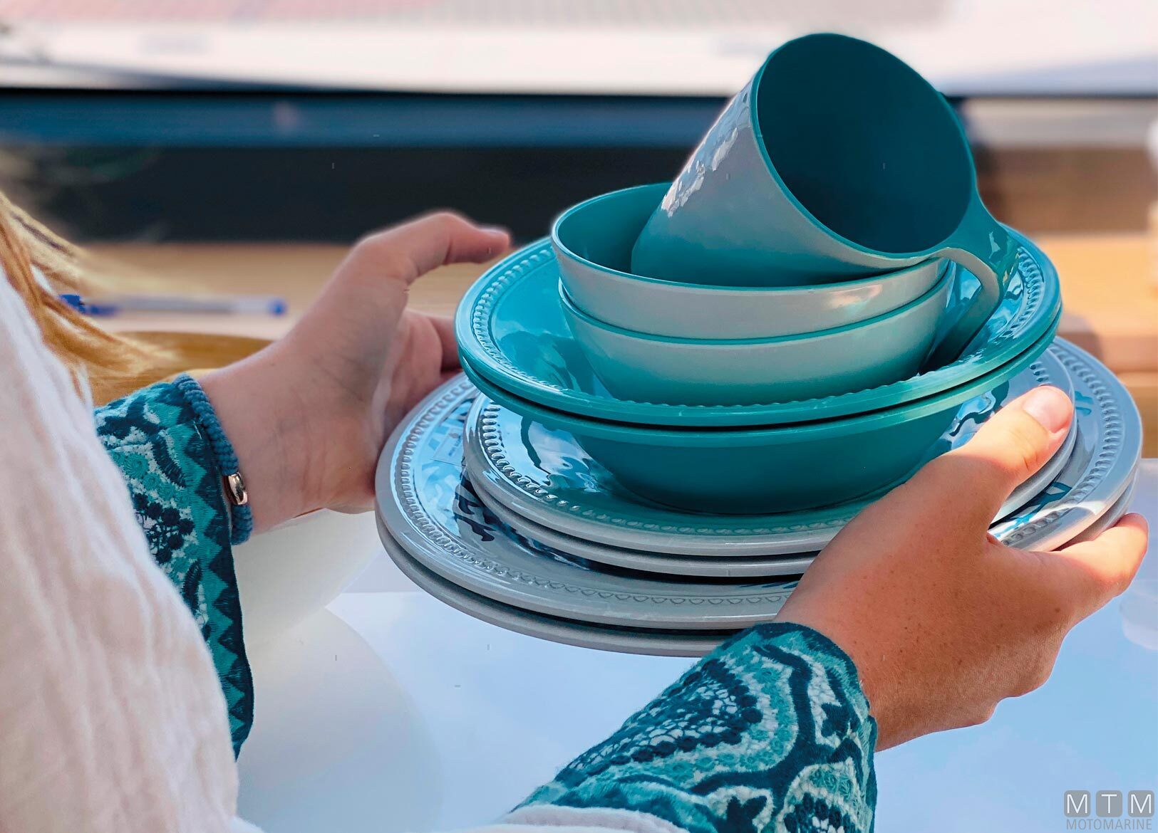 Ciotola con decoro Aqua e base antiscivolo in confezione da 6 pezzi. In Melamina garantita 100% per uso alimentare. Lavabile in lavastoviglie, infrangibile e anti-macchia.