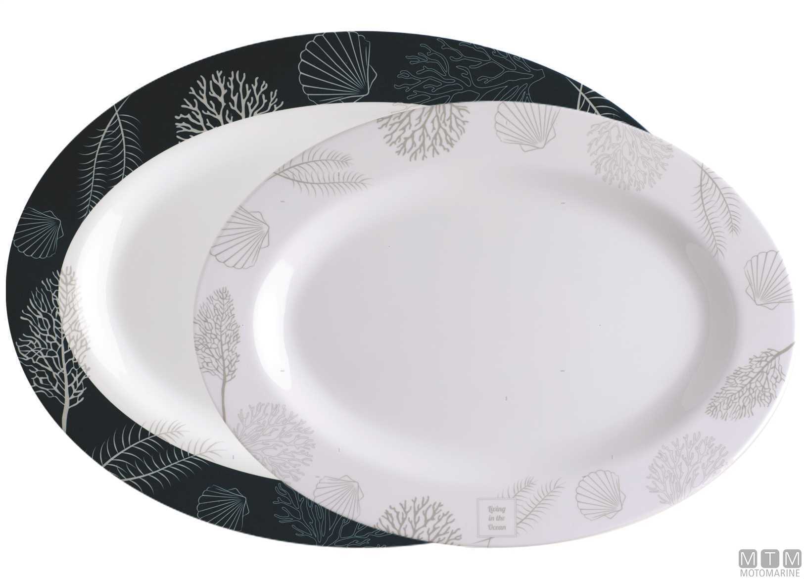 Due piatti da portata con decoro Living. In Melamina garantita 100% per uso alimentare. Lavabile in lavastoviglie, infrangibile e anti-macchia.