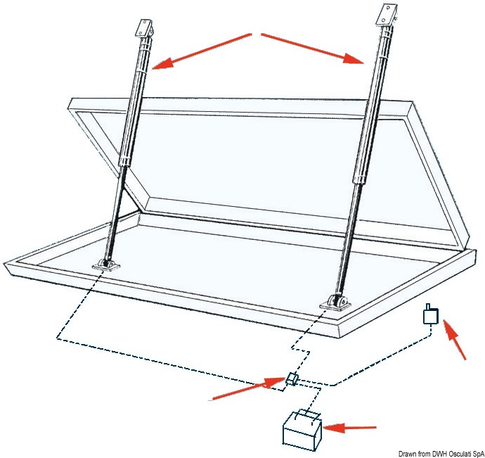 Corpo Ø 48 mm, spinta massima singolo attuatore 120 kg. Apertura di emergenza manuale, sistema elettronico che, in caso di montaggio in coppia o in numero superiore bilancia i giri motore per avere un sollevamento sincrono, velocità 17 mm/sec. Con corpo in alluminio e stelo telescopico inox, impermeabile IP65. Apertura totale o parziale del portellone in tutte le posizioni volute.