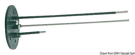 Sonda per serbatoi acque nere, lunghezza regolabile tagliando le astine. Si abbina al pannello di comando WC (50.204.42). Flangia standard internazionale 5 fori.