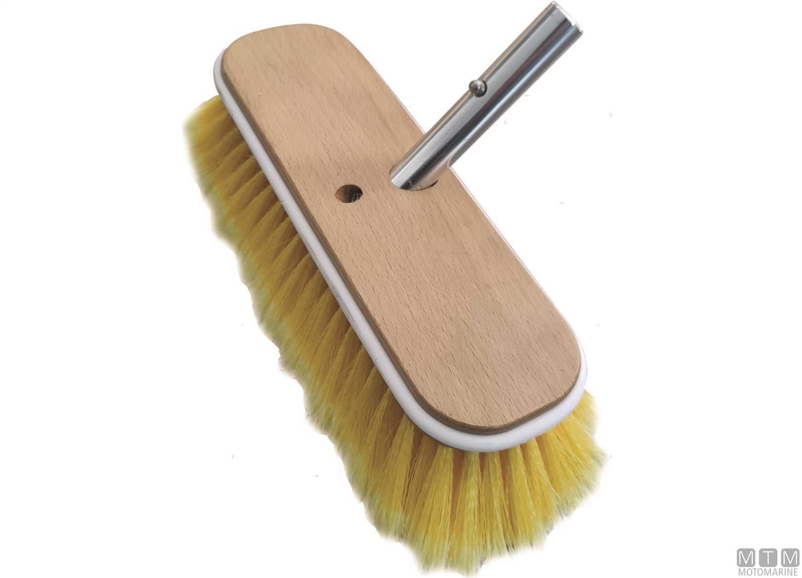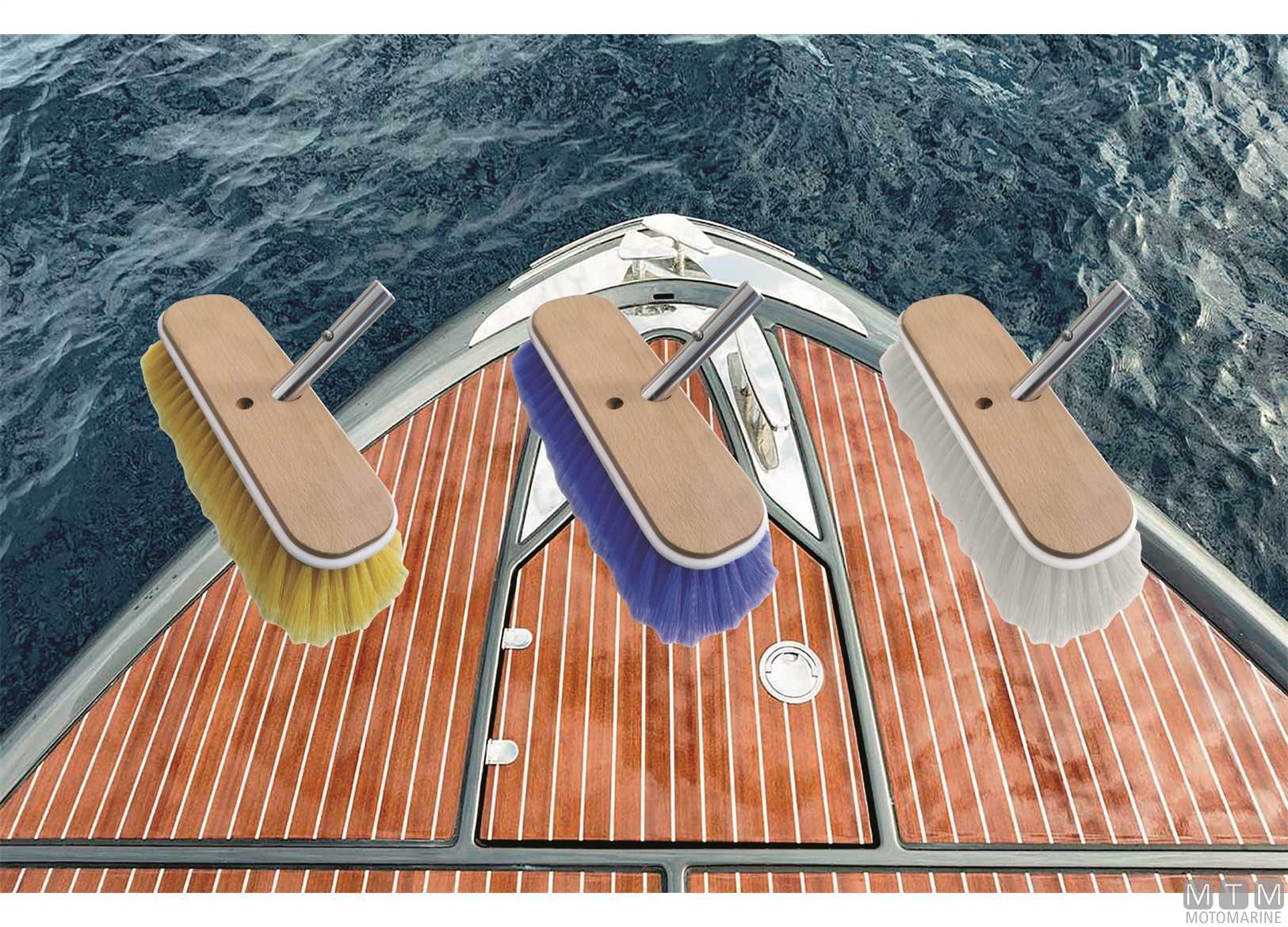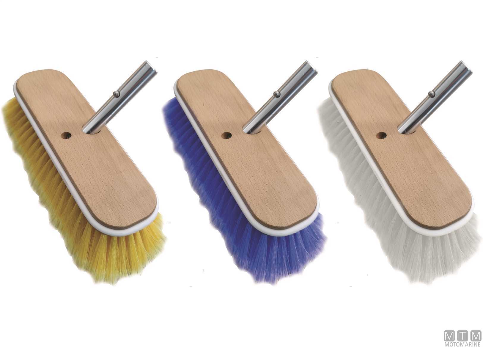 Spazzole in legno di Faggio laccato con bordo antiurto in gomma, da completare con manico.↵Spazzola Gialla - setola morbida: ideale per il lavaggio di finestrature e pareti↵Spazzola Blu - setola media: perfetta per la pulizia generale a bordo↵Spazzola Bianca - setola dura: per il lavaggio di ponti, superfici ruvide e molto sporche
