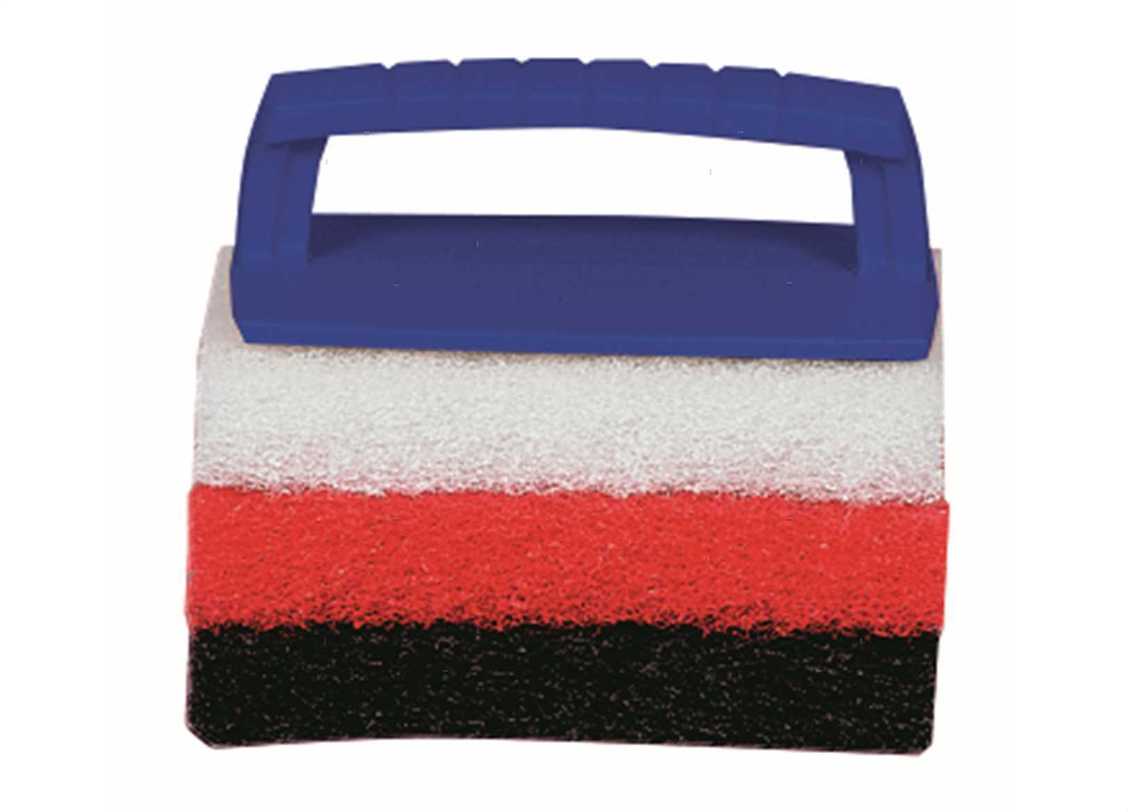 Kit pulizia con maniglia ergonomica e set di tre spazzole pattelle intercambiabili:↵Morbida, Media e Ruvida.