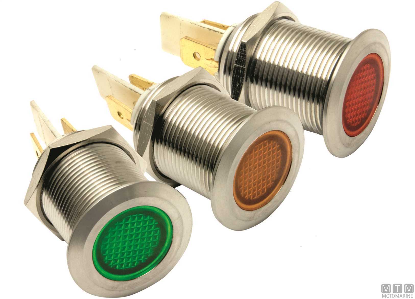 Spie stagne LED 12V in Acciaio Inox. Complete di dado e guarnizione. Spessore pannello max 21 mm.