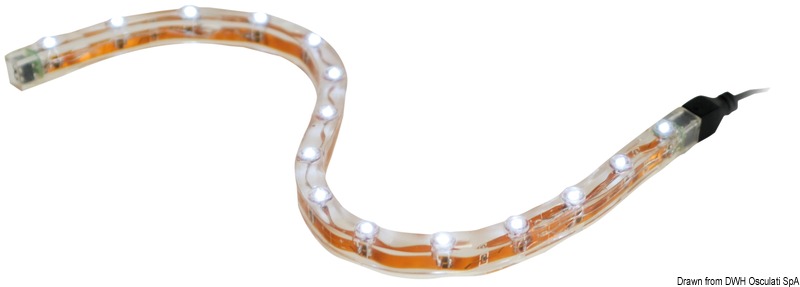 Autoadesive, impermeabili, provviste di microconnettore terminale che permette di collegarle in serie e di cavetto di collegamento con microconnettore.