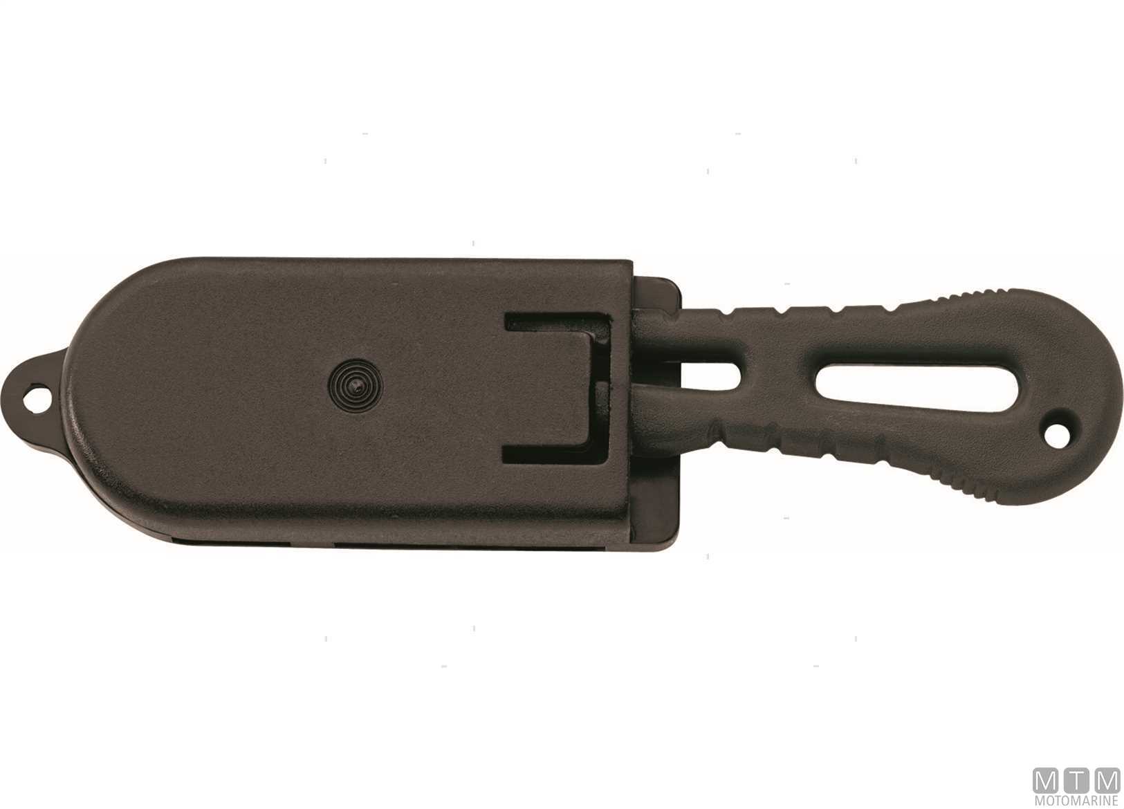 Lama tagliasagole contornata da una protezione in Plastica. Completa di fodero. Permette di tagliare in totale sicurezza sagole e cinghie di qualsiasi tipo.
